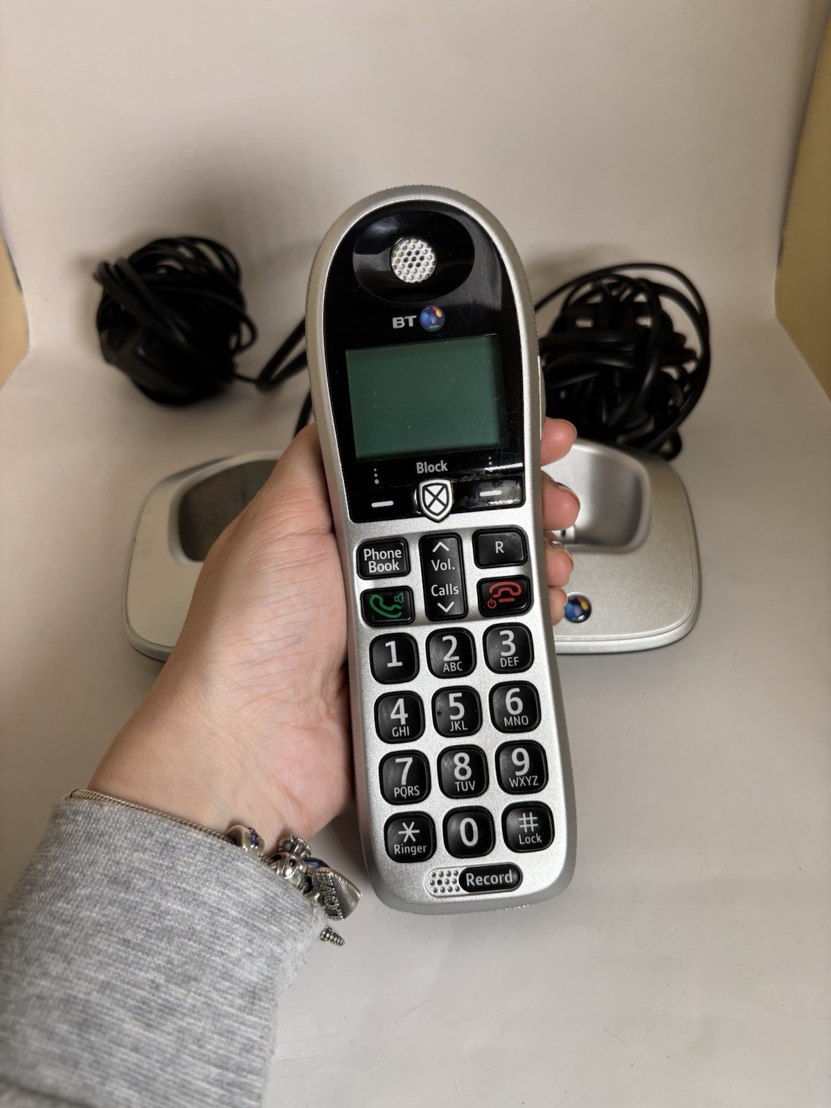 BT4600 Trio digital cordless telephone set with built-in answering machine and call blocking features. Includes base unit and two additional handsets with charging docks. ✔ BT4600 model with TrueCall call blocking ✔ Trio set – 3 handsets total ✔ Answering machine base with playback controls ✔ Large easy-read buttons & display ✔ Ideal for home or office use 📦 Included: * 3x Handsets * 1x Main base unit with answering machine * 2x Charging docks * Power cables 📦 Condition Notes: * Good used condition with light cosmetic wear * Screens and buttons clean (see photos) * Untested beyond power (if applicable – adjust if you tested) * May require new batteries for optimal use Great reliable phone system with nuisance call blocking – perfect for everyday use.