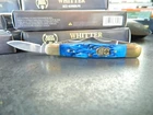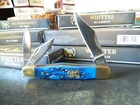WE HAVE (6) WHITTLER 3 1/2" DARK BLUE JIGGED BONE HANDLES, some say it looks like a Coke Bottle design call it what you like. One thing that sticks out to me is it has two Clip Point Blades and one Spear Point or Pen, the large clip point is 2 1/2" with a 2 1/4" edge the small one 1 1/2" with 1 1/4" edge, and the Spear Point is the same 1 1/2" 1 1/4" This is the Limited Edition part of this knife along with the handle design both sides of the handle come to a point. Most Whittlers only have one side of the handle pointed, the bottom. BUCK CREEK CUTLERY of SOLINGEN GERMANY, LIMITED EDITION 3 1/2" CLOSED WHITTLER DESIGN POCKET KNIFE WITH A BLUE PICK BONE HANDLE, almost all companies have stopped making this design it's too costly and hard to get the Bone right. But the smaller companies like BUCK CREEK have the time and money to do this and do it right, they put two Clip Point style Blades and a Pen or Spear point blade on this handle made of 440HC Stainless steel (Rc) 56 to 58 hardness, Nickel Silver Bolsters, and Brass Pins and Liners. And the Back Springs are slammers so please be careful, and they put their Logo on an brass shield embed in the bone. Model # BC 6308BLPB Weighs 2.2oz. Buck Creek is in Solingen Germany, 39 years now in FEB. these are collectors grade knives We will give you $$$$$$$$$$$$$$$$$$$$$$ FREE SHIPPING $$$$$$$$$$$$$$$$$$$ WE THANK YOU AND GOD BLESS YOU. by adding my eBay Store to your Favorites, . - Sign up and receive our emails, why SALES that is the only email we will ever send to you. We are always trying to get different knives into your hands, so by saving you some money maybe you will try out a new brand. Plus every listing we have is put on sale from the highest to the lowest priced items, and lastly many times we put knives that there are only 1 or 2 left in our stock by receiving our email you will get first shot at these items, Thank you Greg