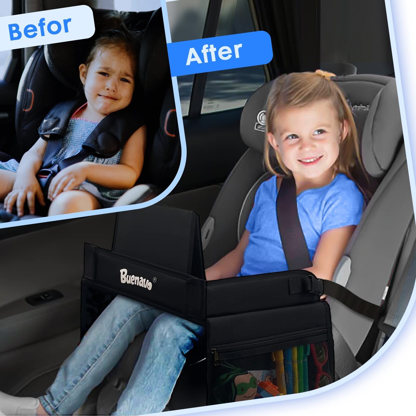 BUENAVO Car Seat Organizer Kids Travel Tray for Kids Toddlers Activities in Car Seat, Stroller, Airplane, Road Trip Essentials Activity Table Black - Buy Now with Fast Shipping! BUENAVO Car Seat Organizer Kids Travel Tray for Kids Toddlers Activities in Car Seat, Stroller, Airplane, Road Trip Essentials Activity Table Black Product Details Brand: BUENAVO Material: Polyester, High Density Polyethylene Color: Black(New) Orientation: Forward Facing Product Dimensions: 16"D x 13.3"W x 1.37"H Product Dimensions: 16.54 x 13.5 x 1.26 inches Target gender: Unisex Maximum weight recommendation: 1 Kilograms Material Type: Polyester, High Density Polyethylene Additional product features: Easy to Clean & Use, Stable, Touch Screen iPad Holder, Waterproof Dry Erase Top, Side Pocket Number Of Items: 1 Style: Travel Compatible products: Tablets Best uses: Car Seat Organizer Batteries required: No Orientation: Forward Facing Is portable: Yes Item Weight: 1.94 pounds Key Features ✅ ENTERTAINMENT ON THE GO - kids can watch iPad & Tablet, play toys, make drawings, eat and drink while you can focus on driving on the road, shopping in the mall, or resting on the plane. It can be used for high chairs, conventional kid's chairs, strollers, dinner tables, plane seats, or any type of lap activity. ✅ NO-DROP TABLET HOLDER - The large sized transparent tablet holder fits most tablets. Hook-and-Loop Fasteners on the front panel keeps the tablet in place steadily. No need to worry about keeping it in place on the go. ✅ EASY TO CLEAN & USE - Our car tray has extra soft cushioning to protect your loved one and make cleaning a breeze. The dry erase top is for kids to release their creativity also for parents to clean up easily afterwards. Simply wipe messes away with a wet rag and you're ready to go. ✅ PLENTY OF STORAGE SPACE - Stretchable mesh pockets make great storage for toys, baby books, pacifiers, crayons and snacks. ✅ MADE FOR TRAVELING - Easy to fold flat and carry around design makes this car tray essential for traveling. Go anywhere with one easy to install activity tray providing room for all your kids travel needs! Product Description