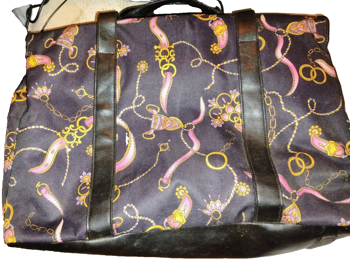 This is a large Bueno tote bag designed for travel and office use, featuring a 3-section interior for organization. The bag is made of black vinyl with a snap closure and brass hardware. It has black handles/straps and is lined with a black interior. The bag is spacious, measuring 21 inches in width, 17 inches in height, and 7 inches in depth, making it suitable for carrying a laptop and other essentials.