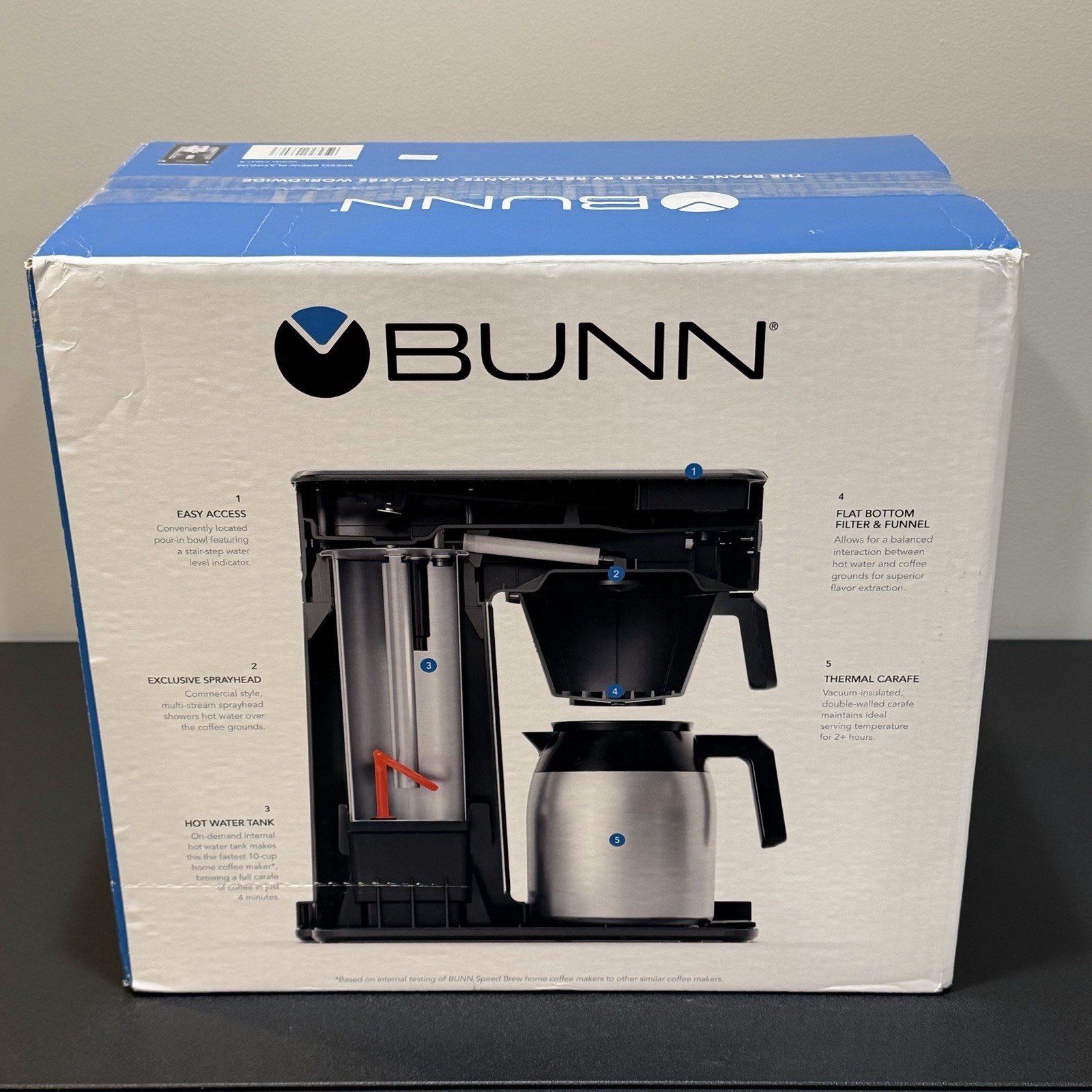 Brand new BUNN Speed Brew Platinum thermal coffee maker (model CSB3T). Factory sealed in original box. Brews up to 10 cups in about 4 minutes with a commercial-style internal hot water tank. Includes stainless steel thermal carafe to keep coffee hot. Box shows light shelf wear but item is new and unused. Details Brand: BUNN Model: CSB3T Speed Brew Platinum Type: Drip Coffee Maker Capacity: 10 Cup Color: Black / Stainless Carafe: Thermal (stainless steel) Features Fast 4-minute brew time Internal commercial-grade hot water tank Multi-stream sprayhead for even extraction Vacuum-insulated thermal carafe (keeps hot 2+ hours) Brews travel mug or full carafe Flat bottom filter & funnel design Designed and assembled in USA 3-year manufacturer warranty New In Box Condition Keywords bunn speed brew coffee maker csb3t thermal carafe 10 cup fast brew new in box NOTE: Please see all photos for condition as all flaws will be shown throughout the photos!