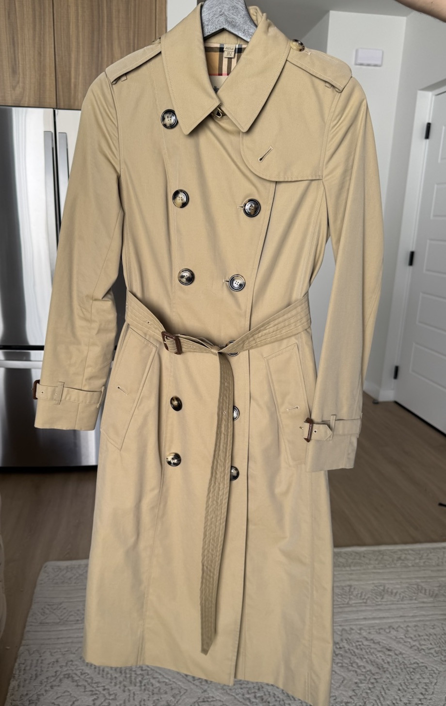 BURBERRY WOMEN CHELSEA TRENCH COAT! LONG! SIZE US 2 IT 36! LIKE NEW CONDITIONS! Comes with original case! Check the photos! The iconic Burberry trench coat, made in England from shower-resistant cotton gabardine. Inside is Burberry Check cotton, used to line our coats since the 1920s. Part of the Heritage Collection, the Chelsea is cut to a slim fit with set-in sleeves. – Double-breasted button closure – Hook-and-eye collar closure – Throat latch – Epaulettes – Belt – Side button welt pockets – Belted cuffs – Back button vent – Burberry Check lining and undercollar – Comes with a garment bag – Slim fit: this style is cut to a fitted silhouette. Fits true to size, take your normal size. – Item 80794071