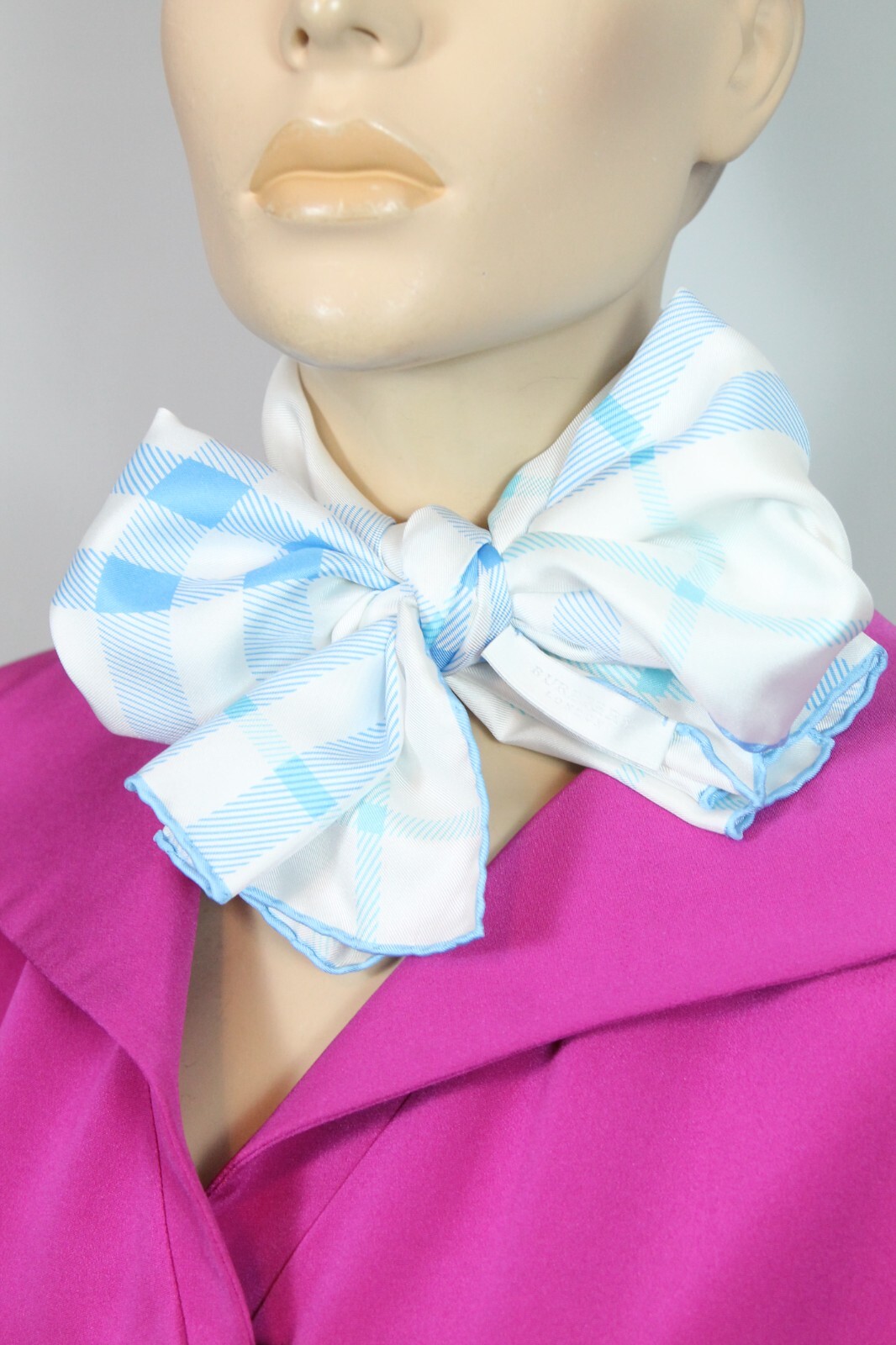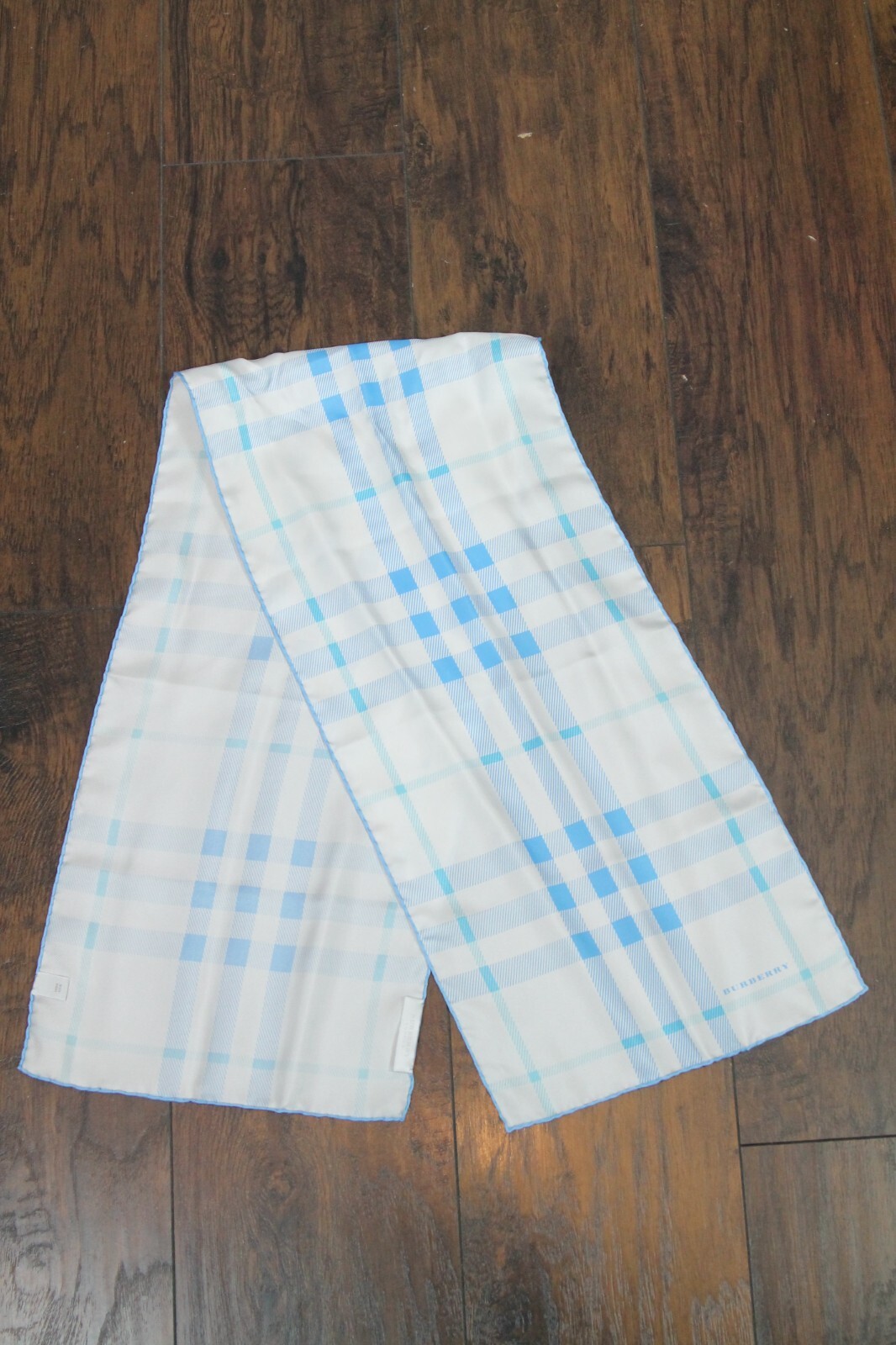 Please consider this authentic luxurious designer BURBERRY LONDON Made in Italy scarf made of pure silk in a white and aqua blue plaid nova check pattern. It is a rectangle shape with handrolled hem. Condition: Pre-owned gently used excellent like new condition (please see detailed pics). Measurements 46" by 11" Please see my other listings on eBay! Track Page Views With Auctiva's Counter