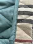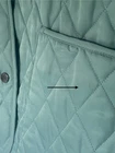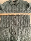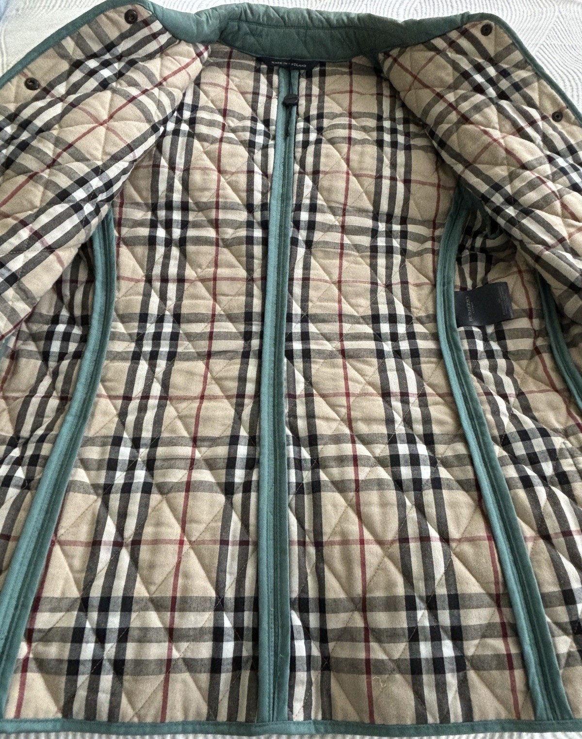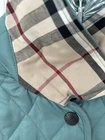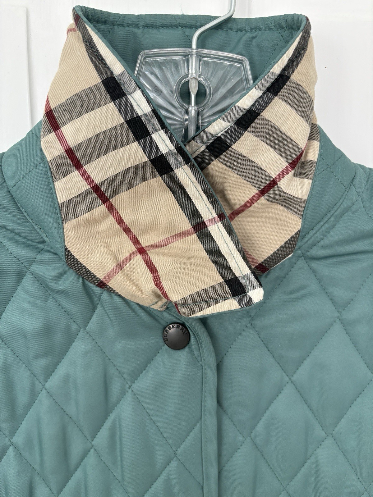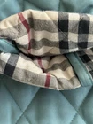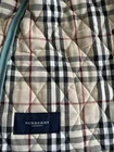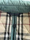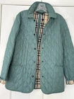 CLASSIC BURBERRY LONDON QUILTED CONSTANCE JACKET WOMENS Size Small Turquoise Blue Green with Nova Check black, white, and red diamond quilted lining. Front snap closure with Burberry hardware. Cuffs and collar can be worn turned up to display lining. Gently worn jacket has a few loose threads and markings. Slight pilling on cuff lining. Please see close up photos. Measured flat Chest 19.5” pit to pit Waist 18” Sleeve 23.5” uncuffed Length 27” collar to hem Shipped within three business days from a smoke free home. Sorry no international shipping.