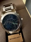 FREE SHIPPING FROM MIAMI DELIVERY TIME 1-4 BUSINESS DAYS ✨ Product Details • Reference: BU9363 (Burberry The City collection) • Movement: Swiss‑made quartz chronograph with 30‑minute and 12‑hour subdials, running seconds, and date window at 4 o’clock • Case Diameter: Approximately 42 mm • Case Material: Brushed and polished stainless steel (solid caseback, screw‑down crown) • Dial: Deep blue sunray finish with embossed Burberry check pattern, applied indices and luminescent hands • Crystal: Scratch‑resistant sapphire (some may list mineral crystal; verify based on your item) • Bracelet: Stainless steel with folding butterfly clasp; fits wrist sizes up to ~7–9″ (adjustable links) • Water Resistance: 50 meters (5 ATM)—suitable for daily wear, splash, or light swimming—but not for diving or high‑impact water activities • Other Features: Chronograph, date display, Swiss precision timekeeping, stylish dress/sport crossover design Shipping & Returns Shipping fast with full tracking 30-day return policy International shipping available