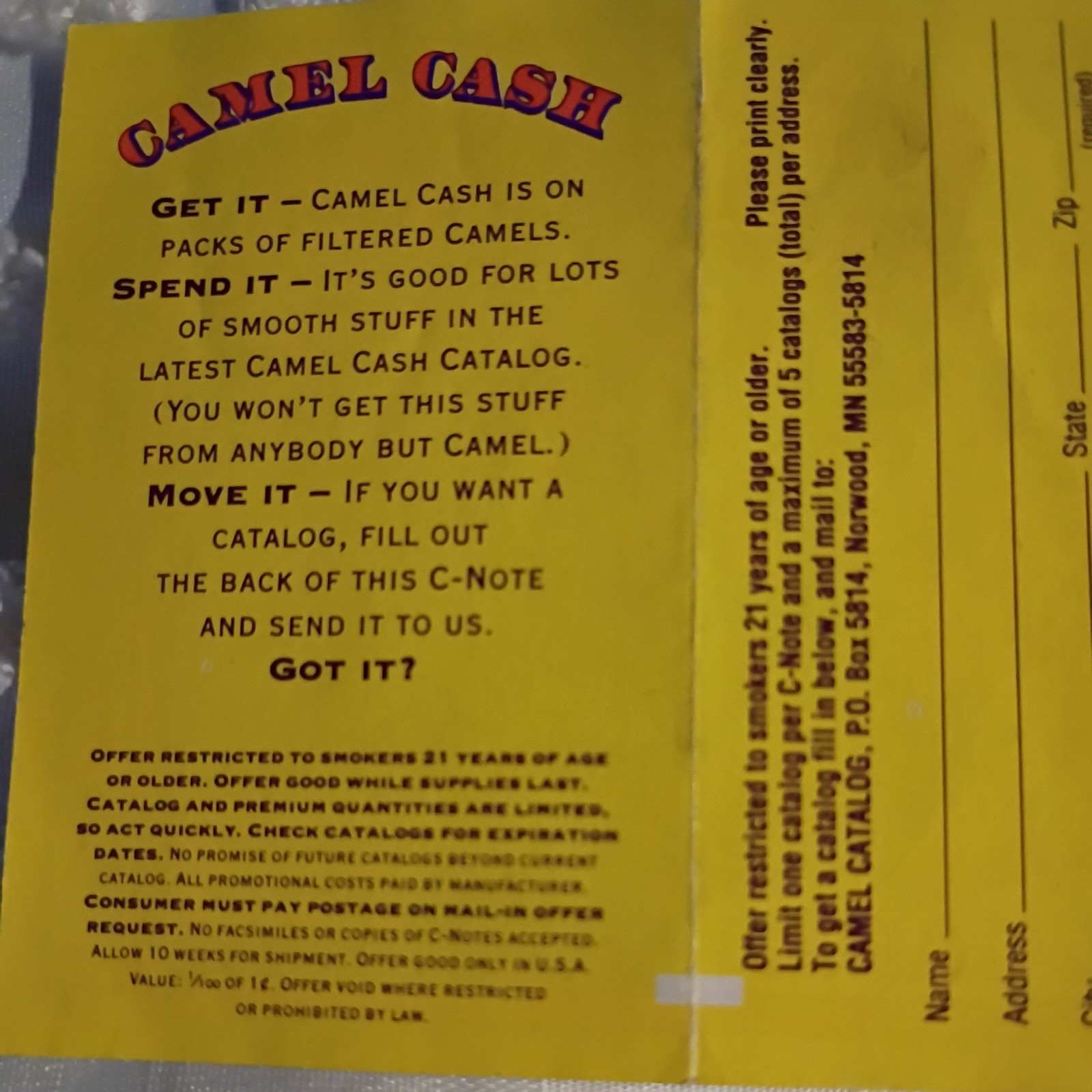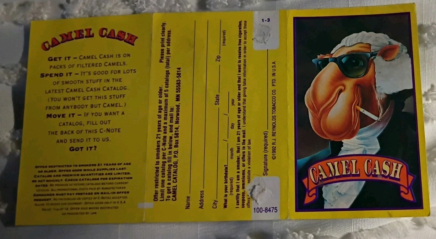 The product is a vintage 1992 Camel Cash $1 C-Note featuring Joe Cool, designed to evoke 90s nostalgia. This collectible item, part of the tobacciana category, showcases the iconic Camel cigarette brand in a unique and retro style. Perfect for fans of vintage memorabilia or collectors of tobacciana items, this rare piece offers a glimpse back into the popular culture of the 1990s. All C-Notes are used but not ripped. Other versions of this note in... The Broome Closet.