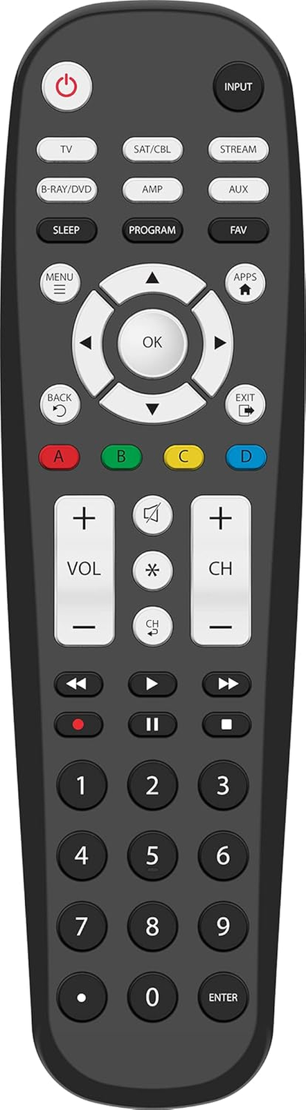 This refurbished product is tested and certified to look and work like new. The refurbishing process includes functionality testing, basic cleaning, inspection, and repackaging. The product ships with all relevant accessories, and may arrive in a generic box Blackweb 6-Device Universal Remote Control Simplify your life and save time juggling through the various remotes in your home with the Blackweb 6-Device Universal Remote. Its the command and control center for your entire home entertainment system! With support for the latest smart TVs, streaming devices, sound bars, and an extensive code library that supports thousands of new and legacy audio/video devices, its the only remote control youll need! Programming is a breeze and can be completed in three simple steps. The ergonomic design and large backlit-buttons make it easy to use day or night. Simple to program and use Control up to 6 devices across brands and platforms Backlit-buttons/ergonomic design
