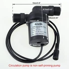 Circulation pump is non-self-priming pump. Max Flow Rate: 2.1GPM, Max Discharge Head: 9.8ft 1/2" Male thread on the pump. The OD of the brass coupler is 10mm. Plug type: 2.1mm x 5.5mm female. NO POWER ADAPTER INCLUDED Power source: DC 12V(NOT INCLUDED), Rated current: 0.7A, Brushless Motor, Low noise: 30db at 1 metre, Service life: 30000 hours Max circulating water temperature: 55°C/131°F. It's submersible but can't be immersed in hot water exceeding 50°C/122℉ Wide Applications: bayite circulation pumps are indeed versatile and find use in various scenarios including: Hot/cold water circulation systems, water transfer projects, beer/wine brewing, funtains, greenhouses, solar water heater systems.... Product Description It's perfect for the home solar water heating systems or other circulation pump application. Brushless Motor, Super long working life, low consumption and low noise. Power source: D C 12V Rated current: 0.7A Low noise: 30db at 1 meter Service life: 30000 hours up Inlet/Outlet: 1/2" male thread. Fit both 1/2" NPT and BSP female thread. We've tested. w/ two brass coupler Max Flow Rate: 8 L/Min(2.1GPM) Max Water Head: 3 meter(9.8ft) Max system pressure: 10Bar(145PSI) It's submersible but can't be immersed in hot water exceeding 50°C/122℉ HOW TO INSTALL THE PUMP PROPERLY: WRONG WAY TO INSTALL !! This pump won't suck water up!