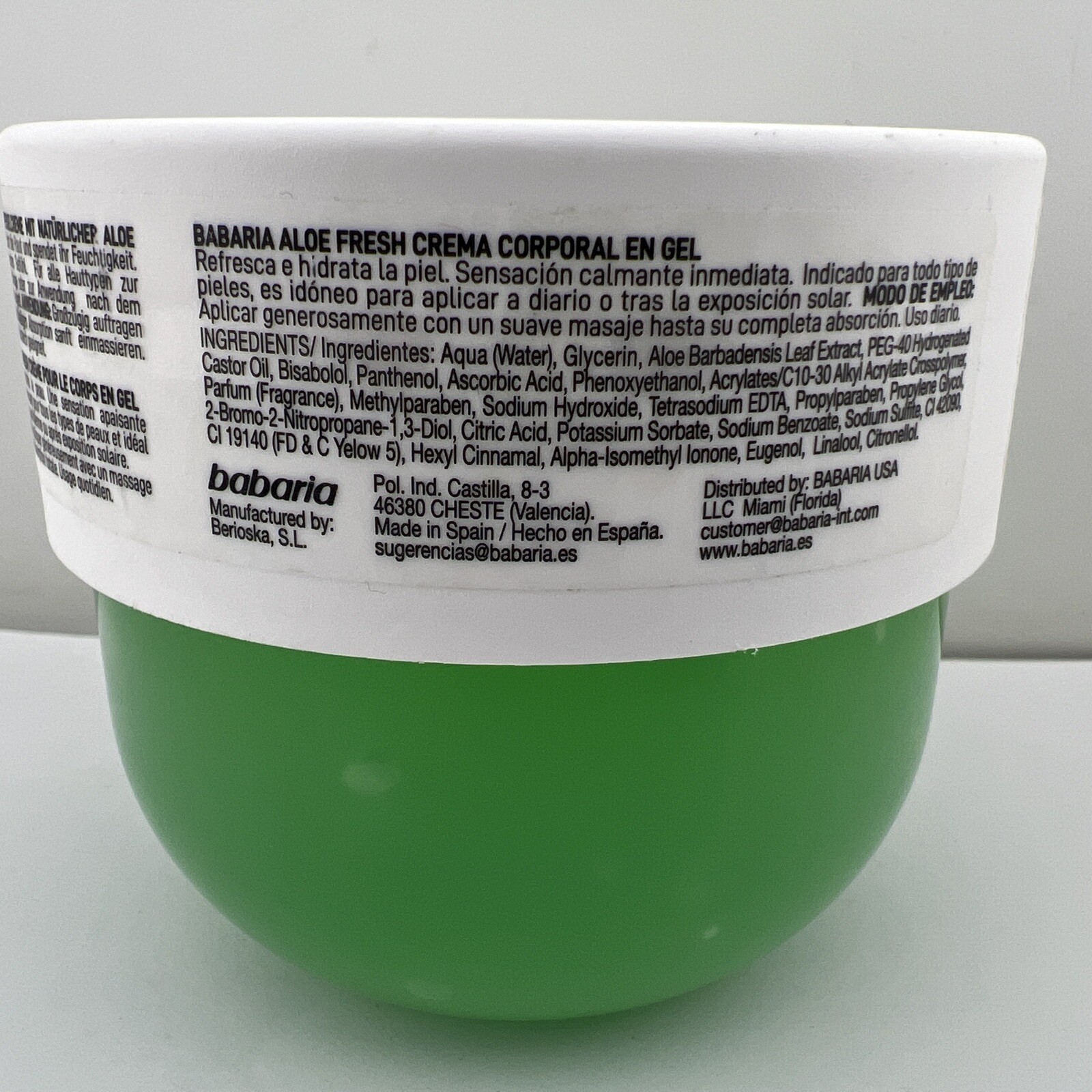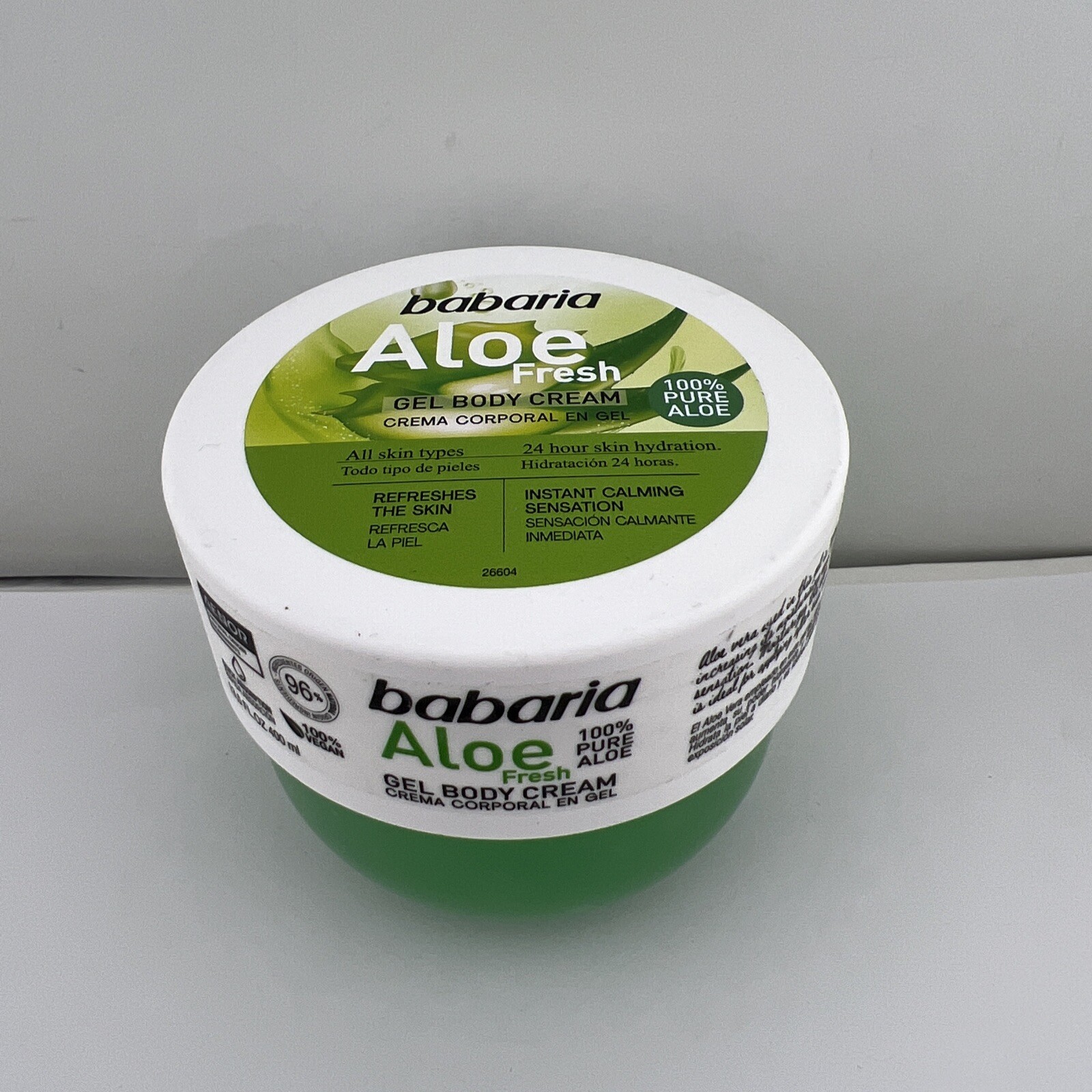 This Aloe Fresh Gel Body Cream by babaria is a moisturizing and refreshing cream designed for daily use after sun exposure. Formulated with 100% pure Aloe Vera, it provides an instant calming sensation to the skin. The light green gel cream is suitable for full body application and offers moisturizing benefits. With a volume of 13.5 fl oz, this cruelty-free product from the babaria Aloe Fresh line contains no UVA protection and has an SPF of 0. Perfect for hydrating and soothing the skin post-sun exposure.