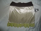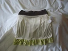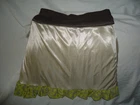 A cute and flirty skirt. The fabric is most likely polyester as it is lightweight, slightly shiny and soft. No stains, tears or signs of wear. (Length from waist band to hem is 17 inches and width across waist is 12 inches)