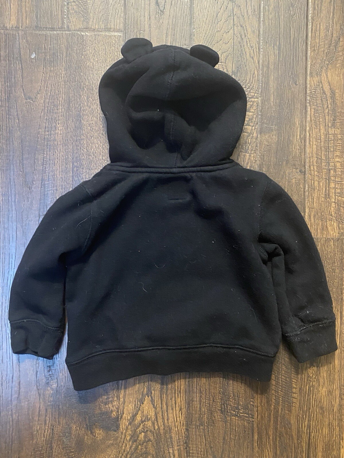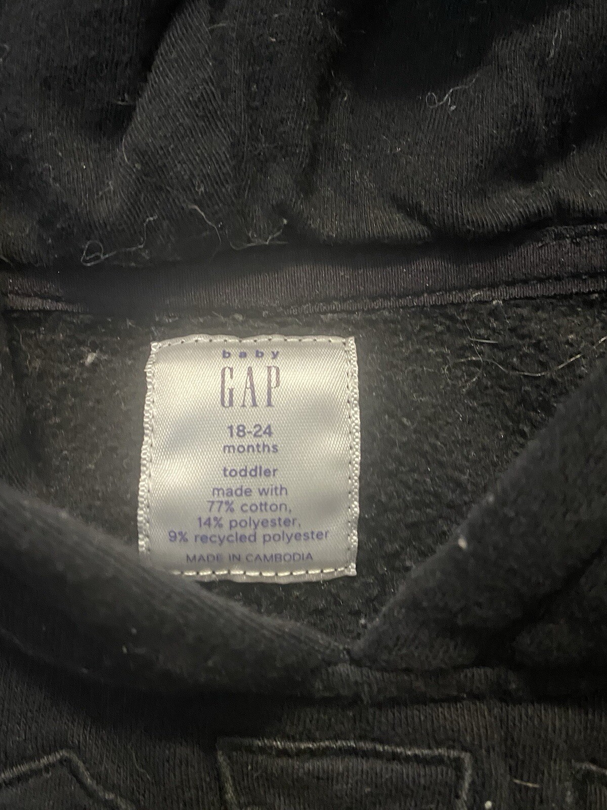 This is a Baby Gap pullover hoodie designed for 18-24 month toddlers. The hoodie is black with ears on the hood, featuring a classic Gap logo design. It has long sleeves, a crew neckline, and a pullover closure. Made of a blended fabric of polyester, cotton, and cotton blend, this sweater is machine washable and suitable for travel, activewear, and casual occasions during the fall, winter, and spring seasons. It also includes a hood, pockets, and is part of the Gap character family.