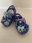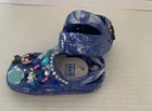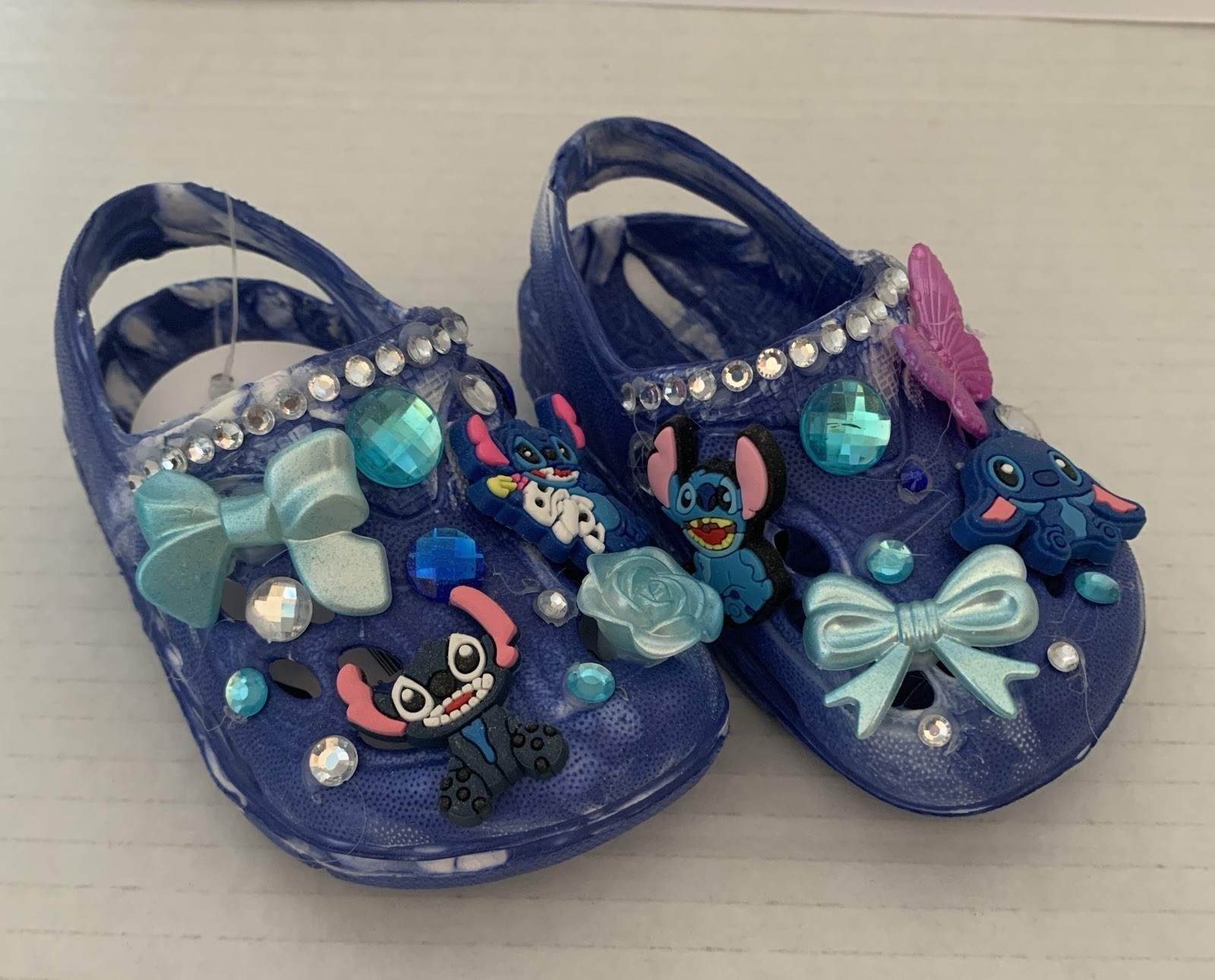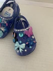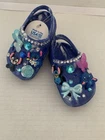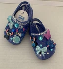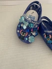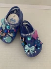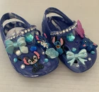 These Baby/Toddler Bling Stitch Charm Croc Shoes in size 2 are perfect for little girls who want to stand out and sparkle. Made of lightweight rubber with glitter accents, these slip-on shoes are handmade and feature a cute stitch character design. Ideal for parties or casual wear, these shoes are durable for year-round wear and are sure to make any little one feel like a star. The blue color and bling theme add a touch of fun and glamour to any outfit, making them a must-have for your little fashionista.