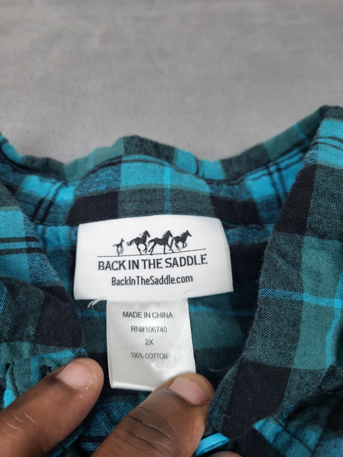 Department:WomenBrand:Back In The SaddleType:Button-UpTheme:HorseSize Type:RegularSeller Notes:“No holes No stains”Size:2XPattern:PlaidColor:BlueNeckline:CollaredMaterial:100% CottonAccents:EmbroideredSleeve Length:Long SleeveFeatures:PocketsStyle:Basic