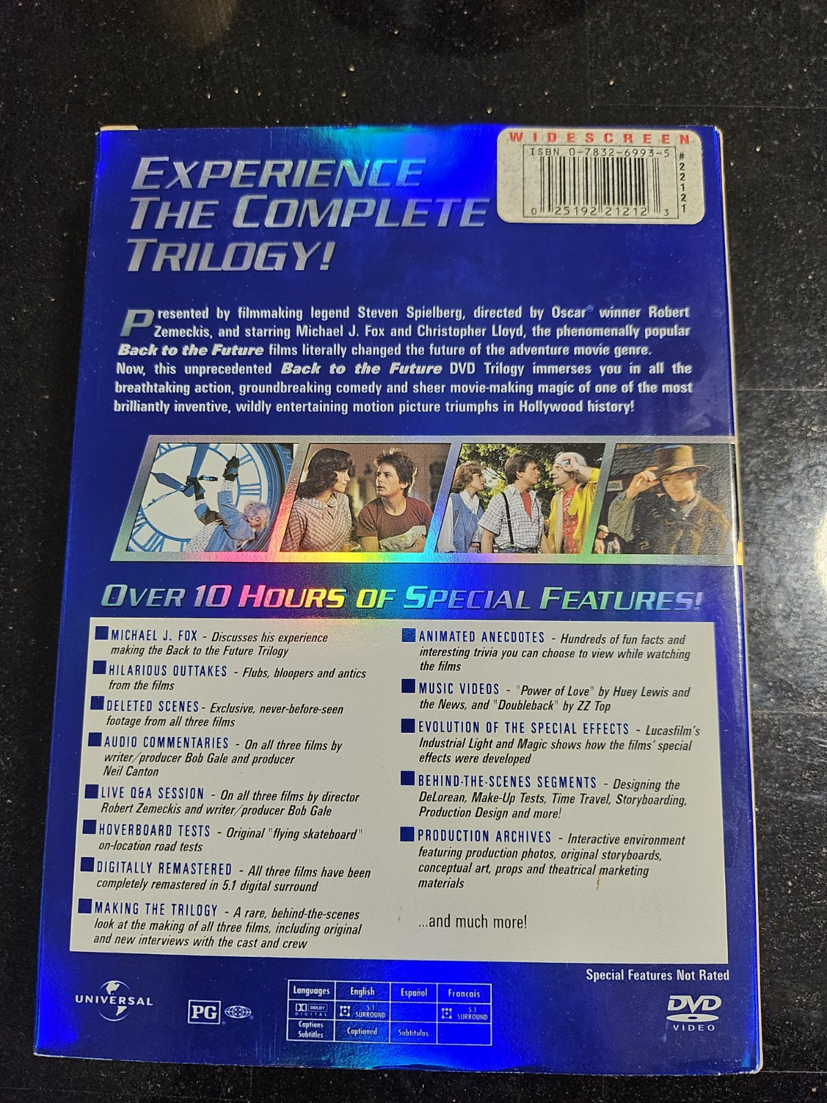 Travel through time with the 'Back to the Future: The Complete Trilogy' DVD set. Relive the iconic adventures with Michael J. Fox and Christopher Lloyd in this 3-disc collection, which includes the original and sequels, all presented in stunning widescreen. Whether you're a longtime fan or discovering the series for the first time, these movies are a must-have for any sci-fi enthusiast. Each disc promises an English language audio experience with optional subtitles for ease of understanding. The set is region 1 coded, perfect for North American viewers. Rated PG, the trilogy is suitable for a wide audience, making it a fantastic addition to any movie lover's library.