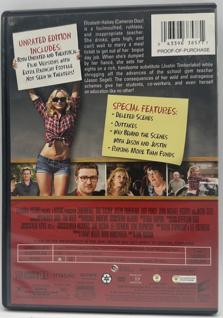 Bad Teacher DVD Widescreen Unrated Edition featuring Cameron Diaz and Justin Timberlake in 2011. Directed by Jake Kasdan and produced by David B. Householter and Jimmy Miller. This dark humor comedy in a Tall/DVD Case includes English, French, and Spanish subtitles. With a runtime of 97 minutes, the cult classic film from Sony Pictures offers an R-rated experience.