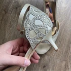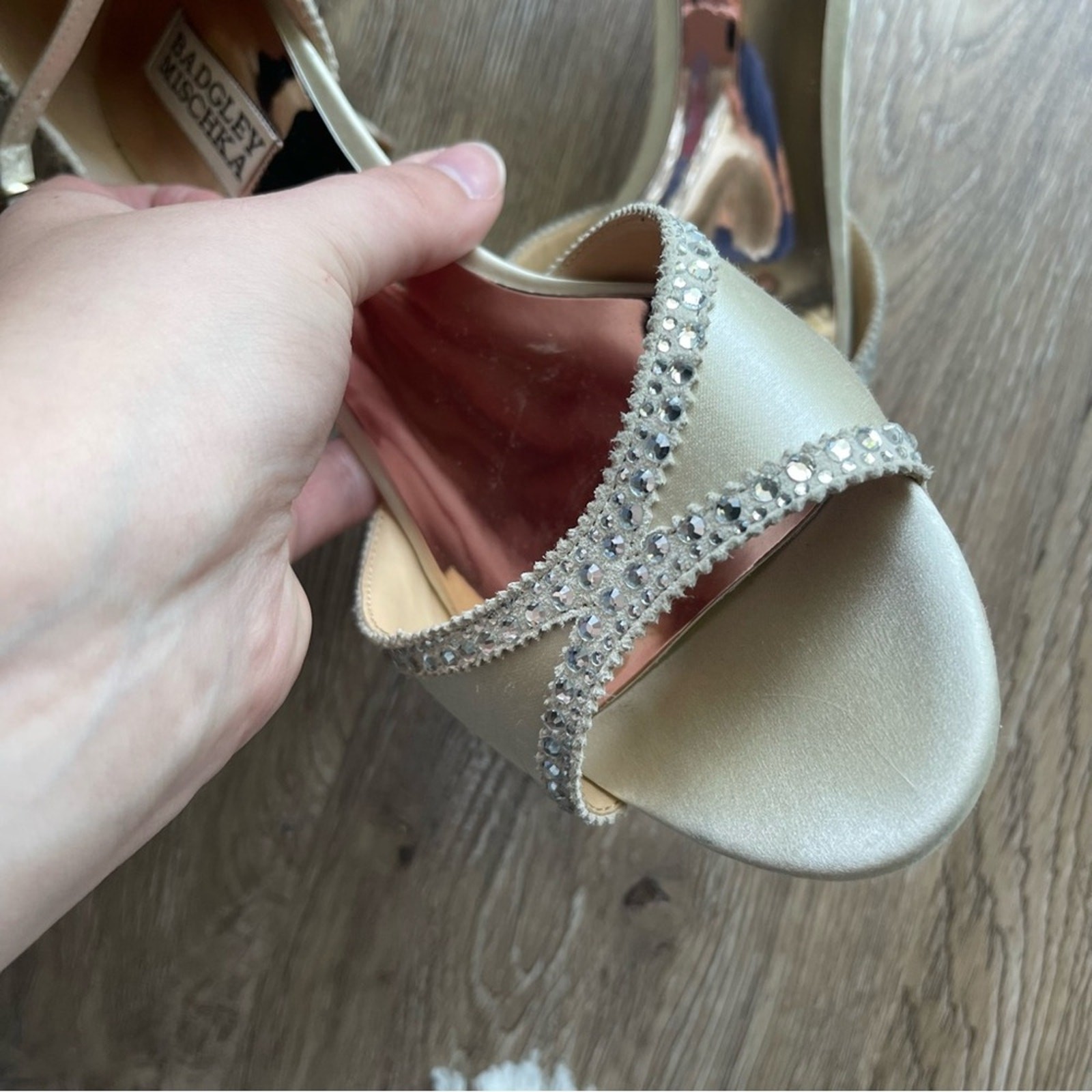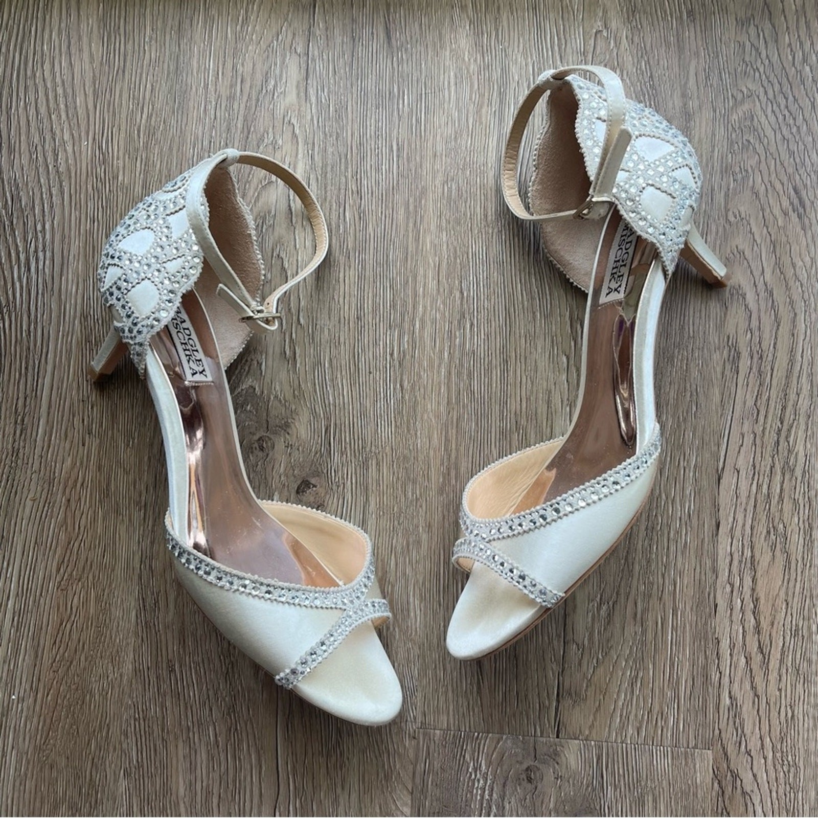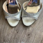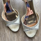 Badgley Mischka Gillian Ankle Strap Evening Shoe Rhinestones Wedding Women's 8.5 This item is in great preowned condition, cute, trendy. Great for parties, events, weddings. Gillian is a glamorous satin heel perfectly poised to add an elegant accent to your ensemble. Light wear pictured, but all rhinestones are present. In a champagne color. 2 Inch Heel Satin Ankle strap Women's Size 8.5
