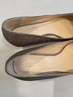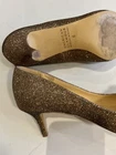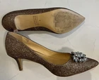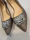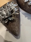Stunning Badgley Mischka evening heels! The rhinestone embellished pumps have a sparkly bronze color that will catch the eye of anyone in the room. The pointed toe and stiletto heel style add an elegant touch, while the slip-on closure makes them easy to wear. Worn once, several beads are missing, barely noticeable. These preppy pumps are perfect for any special occasion, whether it's a wedding or a cocktail party. They are available in US shoe size 6 and EU shoe size 36 with a medium shoe width. The upper material is synthetic, while the lining material is leather. The heels have a height of 3”, making them the perfect height for a night out.