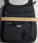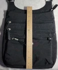 This is a black Baggallini crossbody purse with 4 zipper compartments, designed for travel and everyday use. It features a rectangle shape, silver hardware, adjustable crossbody strap, and various pockets for organization. The bag is lightweight, water-resistant, and includes credit card slots, a mobile phone pocket, and a key clip. Perfect for those looking for a functional and stylish bag for on-the-go.