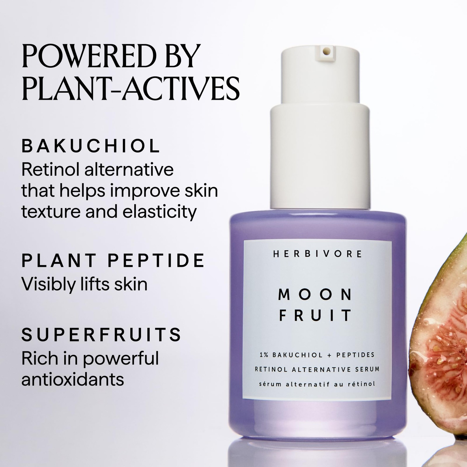 Moon Fruit serum is a naturally derived retinol alternative serum that dramatically improves fine lines & wrinkles without the irritation, redness or dryness experienced by use of a traditional retinol skin care product A facial serum powered by 1% bakuchiol, a highly-researched plant that mimics the smoothing & firming benefits of traditional retinol, and a blend of superfruits containing vitamins C, E, B5 to help reduce signs of aging & improve firmness of skin When used twice daily over a 6 week period, consumers reported firmer and smoother looking skin with less noticeable wrinkles & fine lines, without signs of irritation How to use: Apply 1-2 pumps onto cleansed skin each night, follow with your favorite moisturizer; For additional anti-aging benefits, use 2-3 drops of ’s Phoenix facial oil as your final step Believe in the power of plants; At , we create plant-based, clinically-effective formulas that are safe for you and the environment; Vegan, cruelty-free, sustainably packaged.