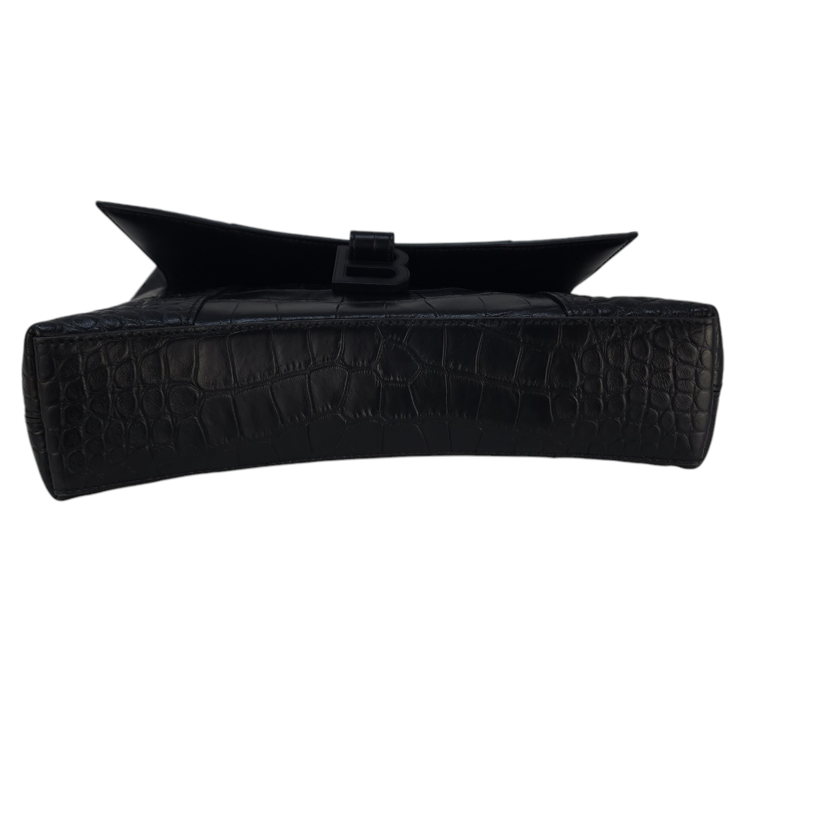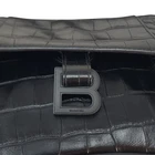 Step into modern luxury with this Balenciaga handbag in black crocodile-embossed leather. Featuring a sleek, structured silhouette and the iconic Balenciaga "B" logo detail, this statement piece exudes sophistication and style. Perfect for elevating any outfit, this versatile bag is a must-have for collectors and fashion enthusiasts seeking timeless elegance. Condition Ratings: Exterior: - The crocodile-embossed leather exterior is in pristine condition with a glossy finish and no visible scratches, scuffs, or discoloration. Interior: - The strap and handle show no signs of wear, cracking, or fraying. Handle/Strap: - The black leather interior is clean, with minimal signs of use. Hardware: - The matte black "B" hardware is flawless, with no scratches, chips, or tarnish. Overall rating: 9/10 Dimension: Height: 6.3 inches Width: 10 inches Depth: 3.3 inches