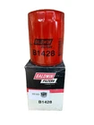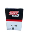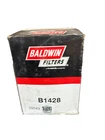 This is a Baldwin Oil Filter B1428, featuring a Spin-On mounting style with a thread diameter of 13/16"-16. It comes with a gasket and is made of metal with a painted finish. The filter has a diameter of 3 11/16 inches and a length of 5 11/32 inches. It is designed for easy installation on the front of a vehicle. The gasket material is rubber, and the filter is manufactured in the United States. No warranty is provided for this new old stock (NOS) item.