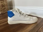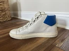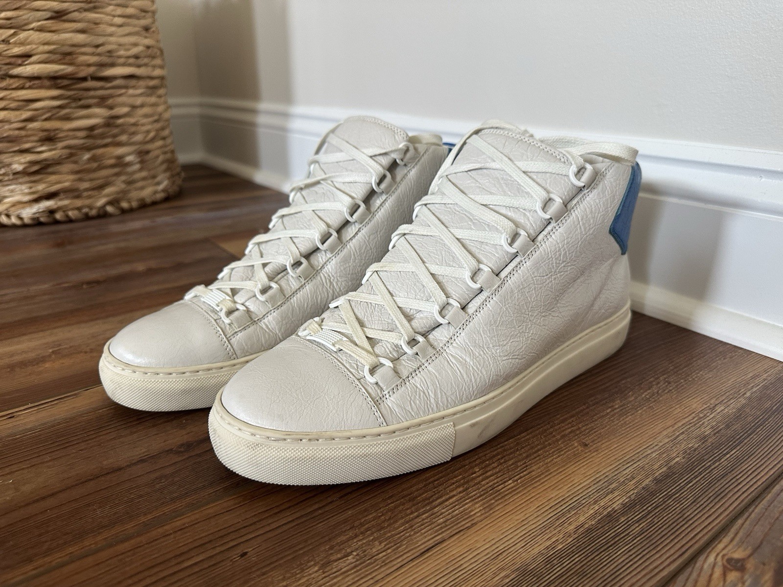 Pre-owned pair of men’s Balenciaga sneakers. You will receive the exact pair of sneakers shown in the photos. Please examine carefully to assess for any flaws before purchasing—I have provided photos of the shoes from various angles and in natural lighting for your consideration. These are leather high-top sneakers with a rubber trim. The primary color is neutral. The accent color is blue. The toes are round and the shoes have a lace-up closure. The laces are white. Balenciaga shoes typically fit true-to-size. Please don’t hesitate to reach out with any questions—and thank you in advance!