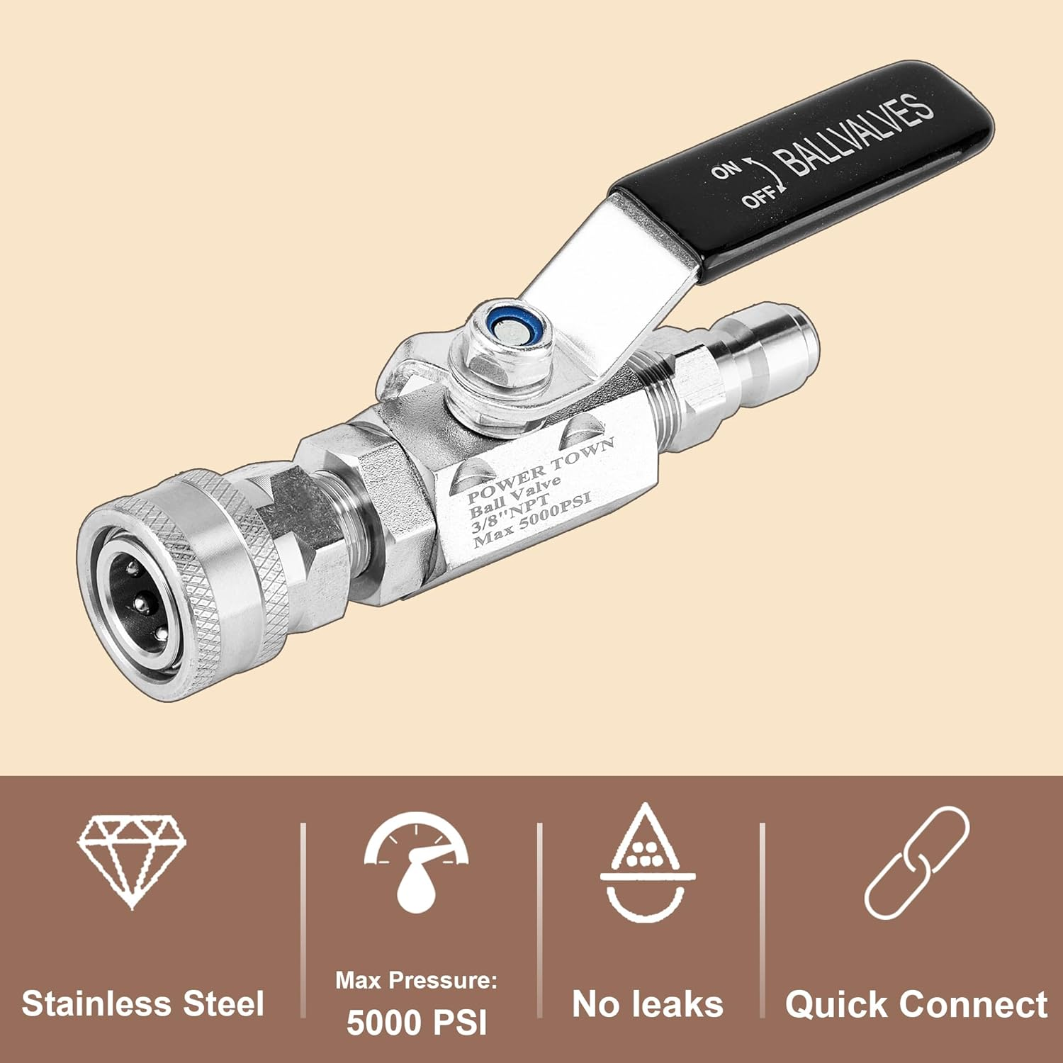 Ball Valve Pressure Washer 3/8" Quick Connect 5000 PSI Shut off Valve for High Ball valve makes pressure washing easier. If you’re constantly needing to change attachments, this is a convenient accessory. It will save you tons of time and effort. Having that ability to shut off the water. Don't need to walk over to the power washer and turn off it, you're able to switch between surface cleaner, wand, or any other attachments. It will remain tight and efficient throughout cleaning tasks. With its easy on-off mechanism, you can swiftly control the water flow. Even under high pressure, the ball valve offers excellent leverage, making it effortless to manage the water output. Pressure washer ball valve with the long arm wrapped in non-slip black rubber, it's easy to grip and control when your hands are wet. 3/8" quick connect fittings are compatible with most brands of pressure washer hose. Crafted from heavy-duty materials. Stainless steel fights off rust and no leaks. They’re made to withstand 5000 PSI, suitable for hot and cold water. Product Description Valve Type Ball Valve Part Number VPW010 Item dimensions L x W x H 4 x 2 x 1 inches Inlet Connection Type Quick Connect Outlet Connection Size 2 Inches Color Silvery Material Stainless Steel Country of Origin China Batteries Required? No Maximum Operating Pressure 5000 Pound per Square Inch Item Weight 14.4 ounces Number of Ports 2 Inlet Connection Size 2 Inches Item model number VPW010 Exterior Finish Stainless Steel Product Dimensions 4 x 2 x 1 inches Power Source Electric Complimentary Shipping and Easy Returns Need to return something? Enjoy our 30-day hassle-free return policy! Take advantage of free shipping across all 48 contiguous states! Your order will be dispatched within 1-2 business days once payment is confirmed. Your Opinion Matters! Your happiness is our main goal! We welcome your feedback! If you encounter any problems, reach out to us right away, and we’ll be here to help. Explore the Extraordinary! Our collection showcases fascinating products that are sure to capture your attention. What surprises await you? Delve in and discover unique items that enrich your daily life. Don't miss the amazing things we have in store for you!