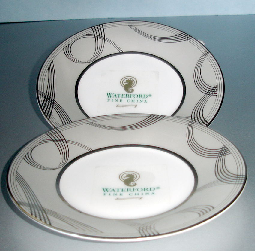 Ballet Encore by Waterford china Bread & Butter Plates, Set-of-2 Elegant Waterford fine bone china featuring a wide gray band with platinum lines and rimmed with bands of precious platinum . • Includes 2 bread & butter plates, 6" in diameter • Dishwasher safe • Made in Japan • New condition, never used, free of chips, cracks or crazing with minor/light shelf wear. Not in retail box but will be carefully packed to ensure safe arrival. ---------- Please closely examine the listing and submit any questions prior to purchase. Pictures may not reflect true colors due to various lighting conditions. Ships from a smoke-free, pet-free environment.