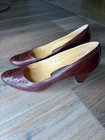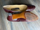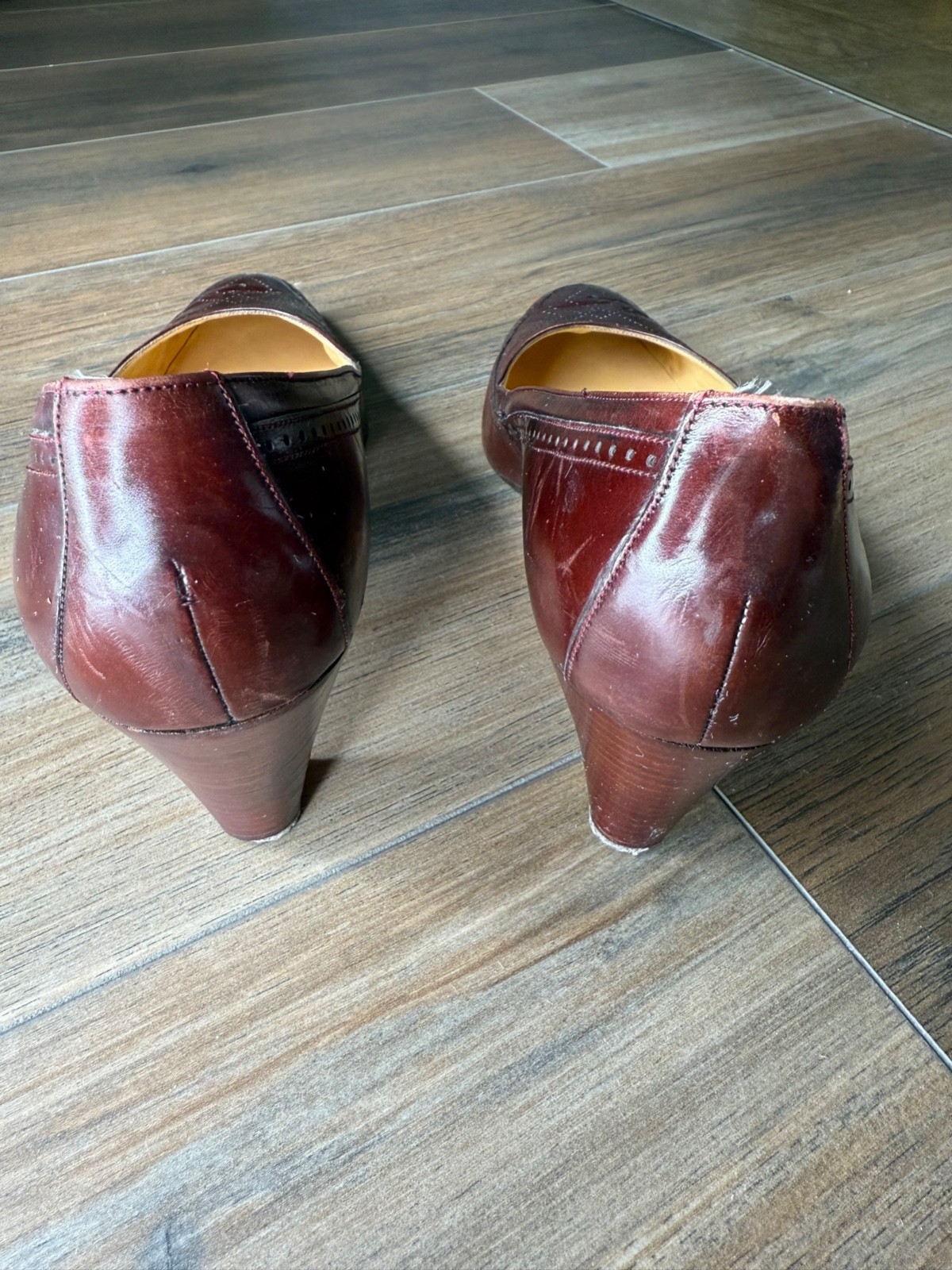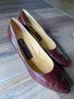 These Bally women's pumps shoes in size 7 feature a striking dark red color with a solid block heel, making them perfect for both casual and business occasions. The pointed toe and slip-on closure add a touch of elegance to these vintage-inspired court shoes. Made of leather with a low heel height, these shoes are ideal for the fall and spring seasons, embodying a retro 60s and 70s style with a hint of metal flair. Made in Switzerland, these shoes exude a unique charm with an angular toe shape and a comfortable leather lining. The heels have some wear on as shown in the pictures, but overall still in a good condition.