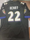 Show your support for the Baltimore Ravens with this black stitched football jersey featuring the number 22 and the name Derrick Henry. Made by Nike, this jersey is perfect for any fan of the National Football League (NFL) and the team. It is a size small and has never been worn, making it an ideal addition to any collection of sports memorabilia. The jersey is designed for men and features the team's colors of black and yellow. Get ready to cheer on the Baltimore Ravens with this stylish and comfortable jersey.