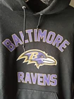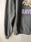 Baltimore Ravens Hoodie Mens Medium Black Team Apparel NFL Football Pullover Sweatshirt Condition: Good pre-owned condition. Shows some light wear with minor pilling and lint present, no major flaws or stains. Please review photos for details. Official NFL Team Apparel hoodie featuring Baltimore Ravens team name and logo in purple and gold on front Pullover hoodie style with drawstring hood and classic kangaroo front pocket Tag size: Medium (Mens) Measured approximately 25 inches pit to pit, 28 inches back length, 21 inches sleeve length Material/care tag is partially visible, fabric is a typical team apparel cotton/poly blend fleece Great for Ravens fans and football season layering