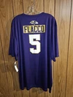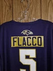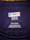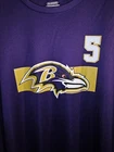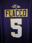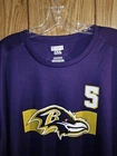 This is a 3XL men's shirt featuring the graphic logo of Joe Flacco from the Baltimore Ravens. It is in the team's signature purple color and is officially licensed by the National Football League (NFL). Made by TX3 Cool in Bangladesh, this new with tags (NWT) deadstock item is perfect for Ravens fans looking to show their support for the team and player.