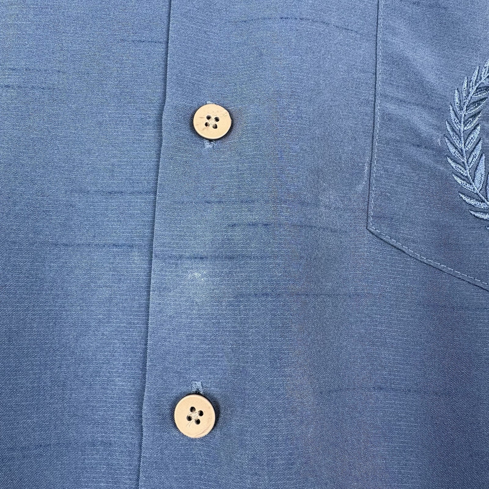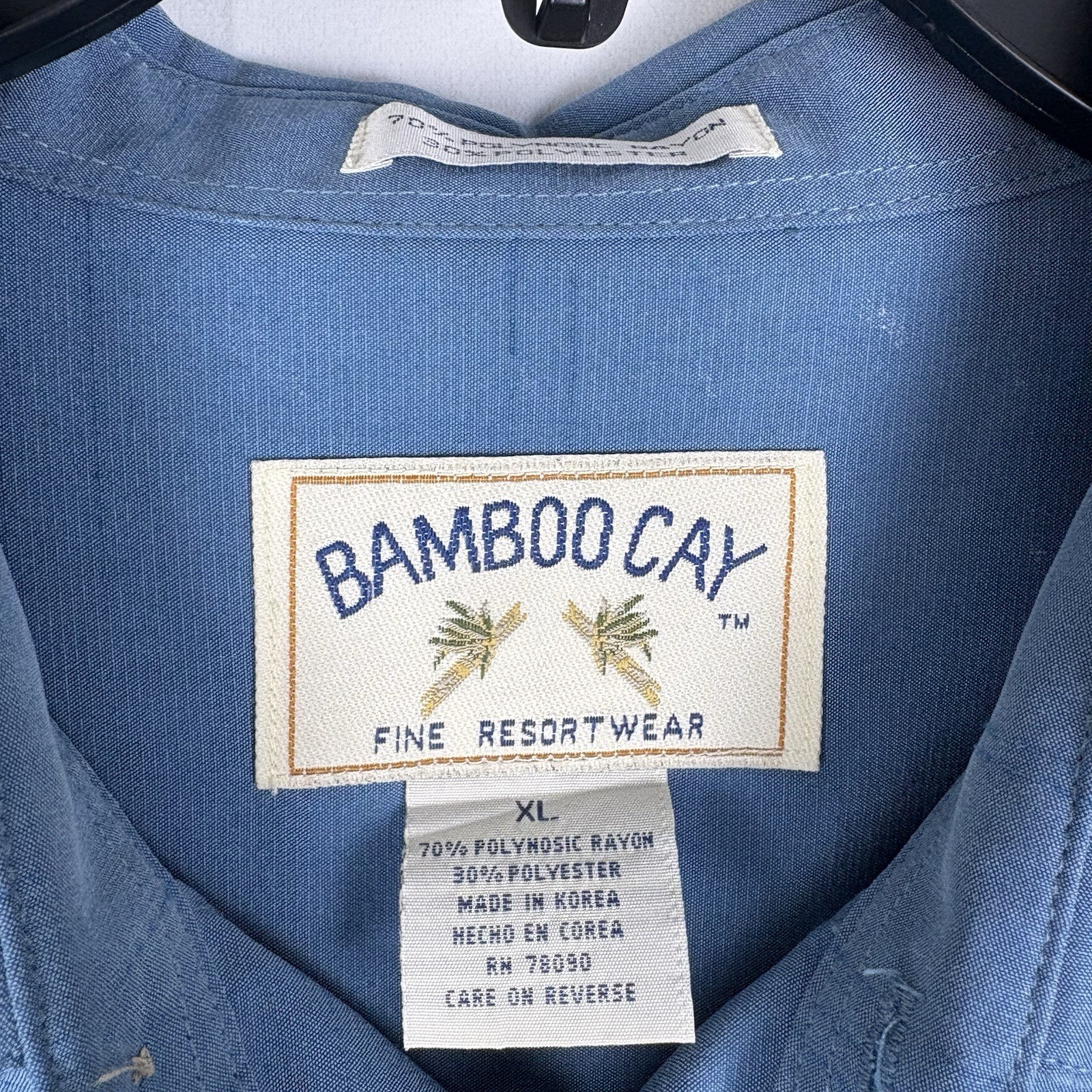 The Bamboo Cay Blue Marlin Hawaiian Tropical Button Shirt in XL size is a stylish and versatile addition to any man's wardrobe. Featuring a vibrant blue color with an animal print pattern, this short-sleeve shirt is perfect for casual occasions or travel adventures. The embroidered accents and Hawaiian theme add a touch of tropical flair, while the collared neckline and button closure offer a classic and polished look. Made from a blend of polyester and polynosic rayon, this shirt is comfortable for year-round wear, making it a must-have for any beach, fish, or aloha-inspired outfit. Shirt is in good shape but has some condition issues, see photos.