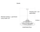 Description Please contact us if you want more. Dimensions:D: 15.7/19.7/23.6/27.6In. H: 10.2 In. Material: Bamboo + Parchment Voltage:110-265V Lamp:Tungsten bulb/LED bulb(Bulbs not included) Lamp holder: E27 Light color: Default yellow light Suitable places: Leisure and entertainment places, corridors, hotel rooms, hotel lobbies, exhibition halls, home places, hotels, cafes, bedrooms, living rooms, restaurants Package:1 x Pendant Light(Bulb don't included) Returning policy : 1) The item can be returned within 30 days after receipt 2)if need returning for replacement or full refund ,please contact us 3) The returning fee is afforded by buyer. Shipping policy: 1)The items will be shipped out within 48hours after payment cleared 2)The items can reach the destination (UK,USA,Australia)within approx 25days. 3)Free shipping to the destination if by airmail .if Other shipping method required ,please contact us .Thank you very much !