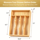 5 Slots Kitchen Silverware Organizer for 8.25" Wide Drawer PREMIUM BAMBOO: Drawer organizer made of organic bamboo (even the base), more sustainable, durable and classy than plastic. SOLID CONSTRUCTION: Strong frame, base and reinforced corners with mortise and tenon structure, this silverware organizer holds up much better and lasts longer than any plastic tray. Knives won't slide through dividers. PERFECT SIZE: Measures 8.25"W x 13"D x 1.9"H, ideal for standard small drawer. We highly recommend to measure your drawer before order. ANTI-SKID: 4 big silicone feet keep the bamboo tray immobile and quiet when pulling out and pushing back the drawer. EASY TO CLEAN: Wipe clean with a cloth dampened in a mild cleaner. Wipe dry with a clean cloth. Don’t put them in dishwasher. A GREAT GIFT IDEA.