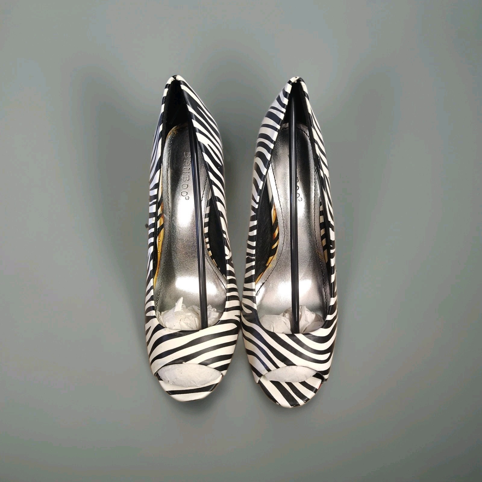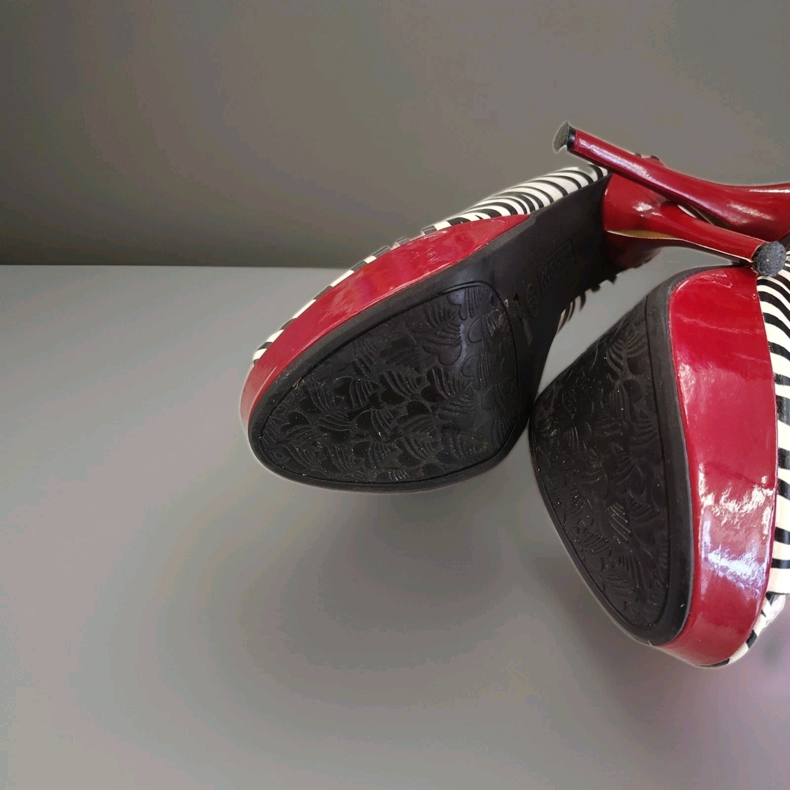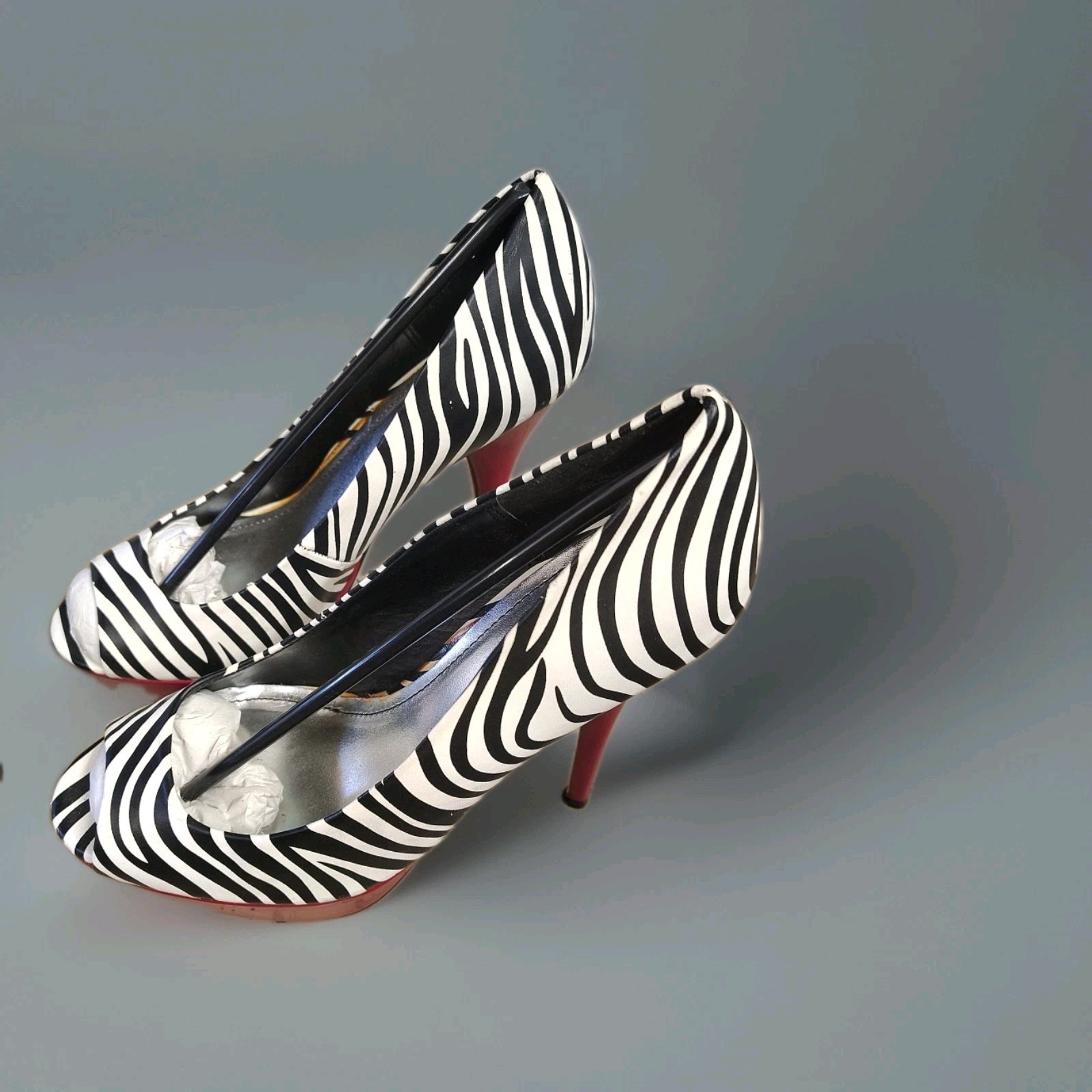 The product is a pair of stylish high heels with a zebra print design and red accents, featuring a multicolor animal print pattern on synthetic upper material. These fashionable heels are designed for women and are sized 7.5 in the US. Perfect for a runway or any other fashion-forward occasion, these heels add a touch of excitement and flair to any outfit. Designed by the brand Bamboo, these high heels are sure to make a statement and turn heads wherever you go.