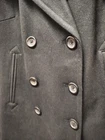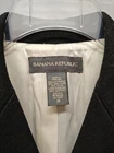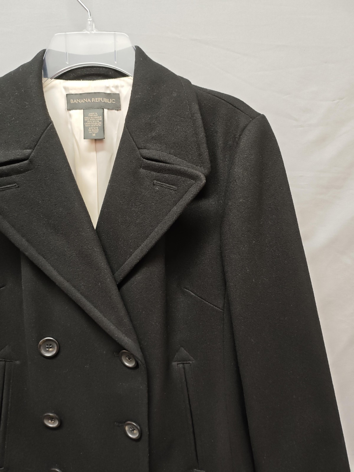 Brand: Banana Republic Style: Womens double-breasted pea coat with wide notched lapels and vertical welt pockets. Color: Black exterior with light-colored interior lining. Size on tag: Womens Medium (M). Materials: Shell 80% wool, 20% nylon; lining 100% acetate. Country of origin: Made in Thailand. Identifiers: RN 54023; CA 17987. Details: Six-button double-breasted front, arrow-detail front hand pockets, smooth full lining, tailored seams at back for a flattering, structured fit.