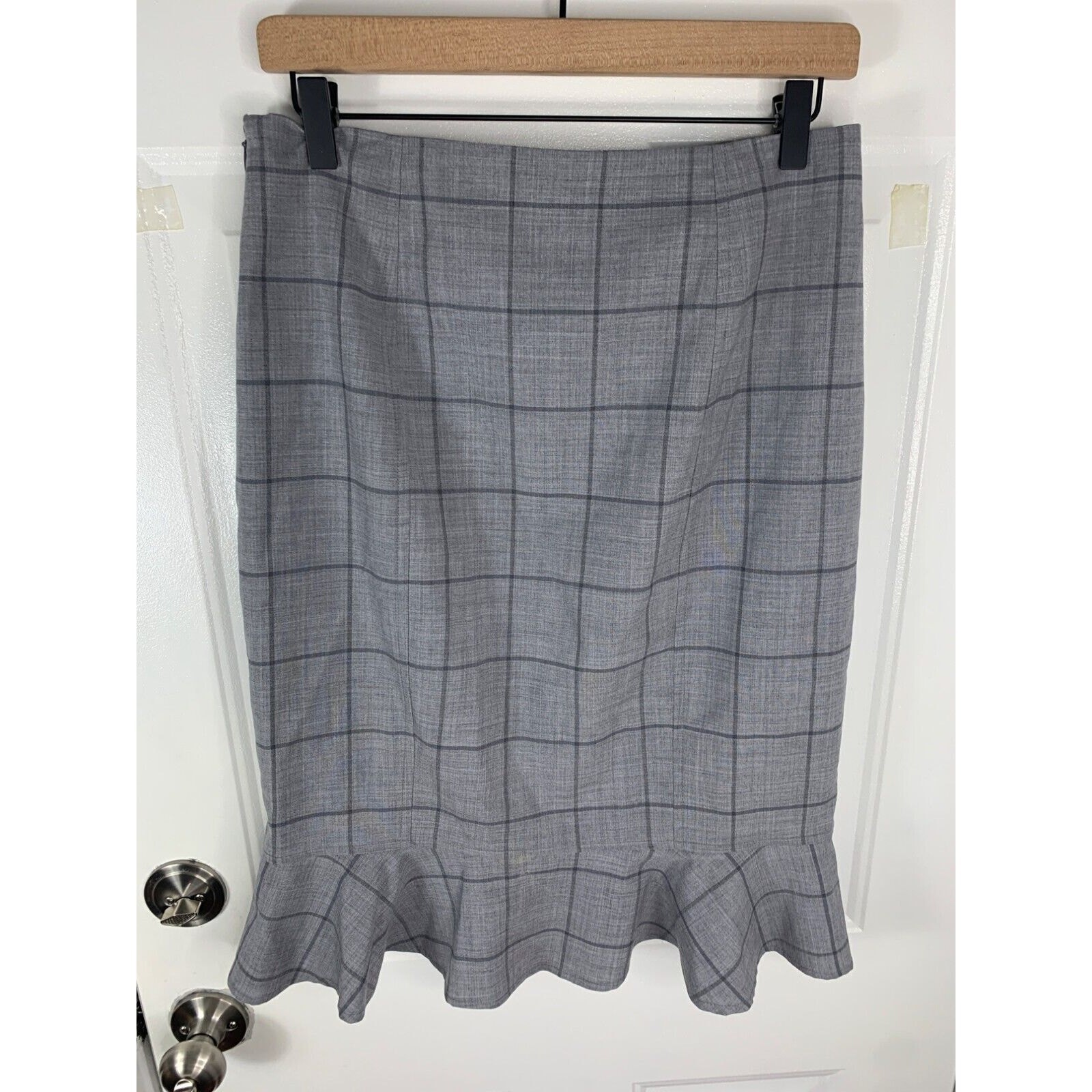 This Banana Republic skirt features a classic gray plaid pattern with a modern ruffle hem. It's designed for professional settings, offering both style and sophistication. The skirt's tailored fit and subtle pattern make it a versatile addition to any wardrobe, suitable for office wear or formal occasions. • Size 6 • Ruffle hem design • Plaid pattern • Zipper closure • Knee-length *Laying Flat Measurements* • Waist - 15" • Thigh - • Rise - 24" From top to bottom • Inseam - • Hip - 17" • opening - 18.5"