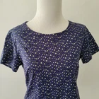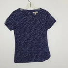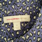 Banana Republic Heritage blouse Size 0 100% cotton Machine wash Pullover styling Round neck Short sleeves Relaxed, boxy silhouette Exposed back zip with grosgrain ribbon pull Purple/blue with white and black animal print No stretch Approx. lay-flat measurements: Length: ~24.5" Pit to pit: ~16.5" Excellent pre-owned condition. No notable flaws/signs of wear