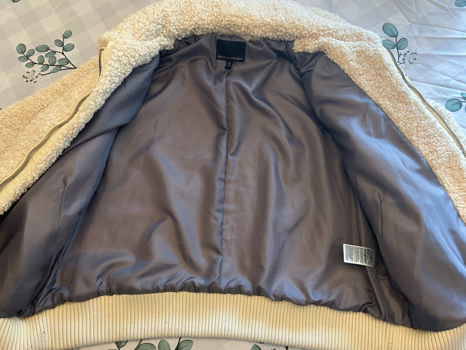 The Banana Republic Ivory Sherpa Teddy Fleece Bomber Jacket in size XL is a stylish and cozy outerwear piece perfect for colder weather. Made of polyester with a soft fleece lining, this short jacket features a zip closure and classic fit. The solid ivory color and zipper accent add a touch of sophistication to the casual design. Ideal for the winter and fall seasons, this jacket also includes lined collar and pockets for added warmth and functionality. Designed for women who appreciate quality and timeless style, this Banana Republic jacket is a fashionable choice for any occasion.