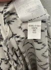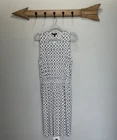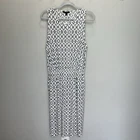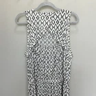 This is a Banana Republic dress in size L, featuring an off-white Ikat pattern on a knit fabric. The sleeveless dress has a round neckline, a midi length, and an open back design. It has a pullover closure and is made of a blend of polyester and spandex. New with tags. Side pockets Measures approximately 20” across bust laying flat and 45” in length from shoulder to hem 2
