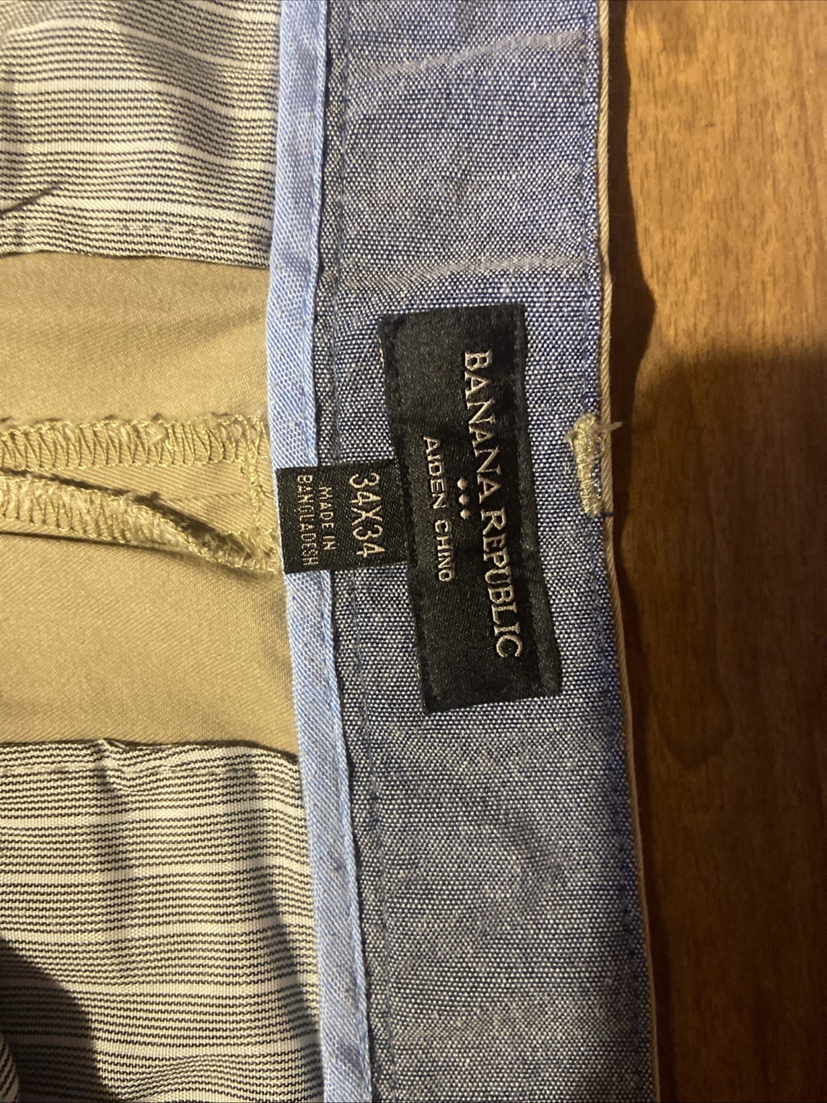 The Banana Republic Men's Khaki Chino Pants in size 34x34 are perfect for casual occasions with a mid-rise and straight leg style. Made from cotton, these solid beige pants feature a flat front and button accents. They come with slash pockets and are machine washable, making them easy to care for. Ideal for summer, fall, and spring, these pants offer a preppy and stylish look for any man's wardrobe.