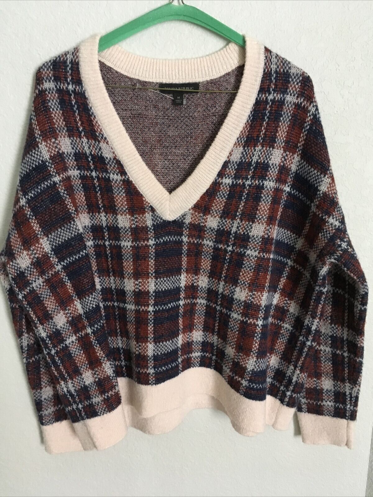 Banana Republic Wool Mohair Nylon Acrylic Plaid Sweater Drop Shoulder M. Condition is "Pre-owned". Please review pictures for cosmetic condition. Approximate measurements in inches while laying flat: Armpit to armpit: 25 Sleeve length from armpit seam to end: 17 Front length: 14 from deepest point of V *ic