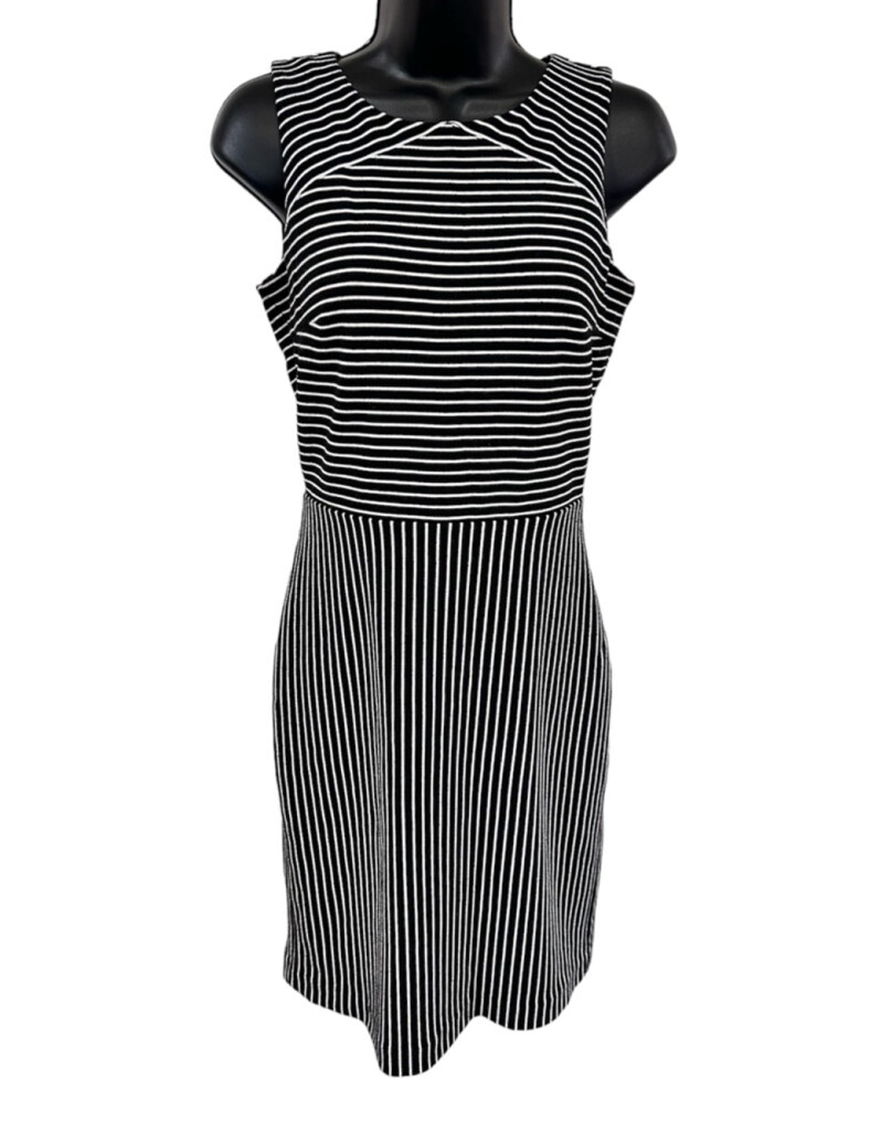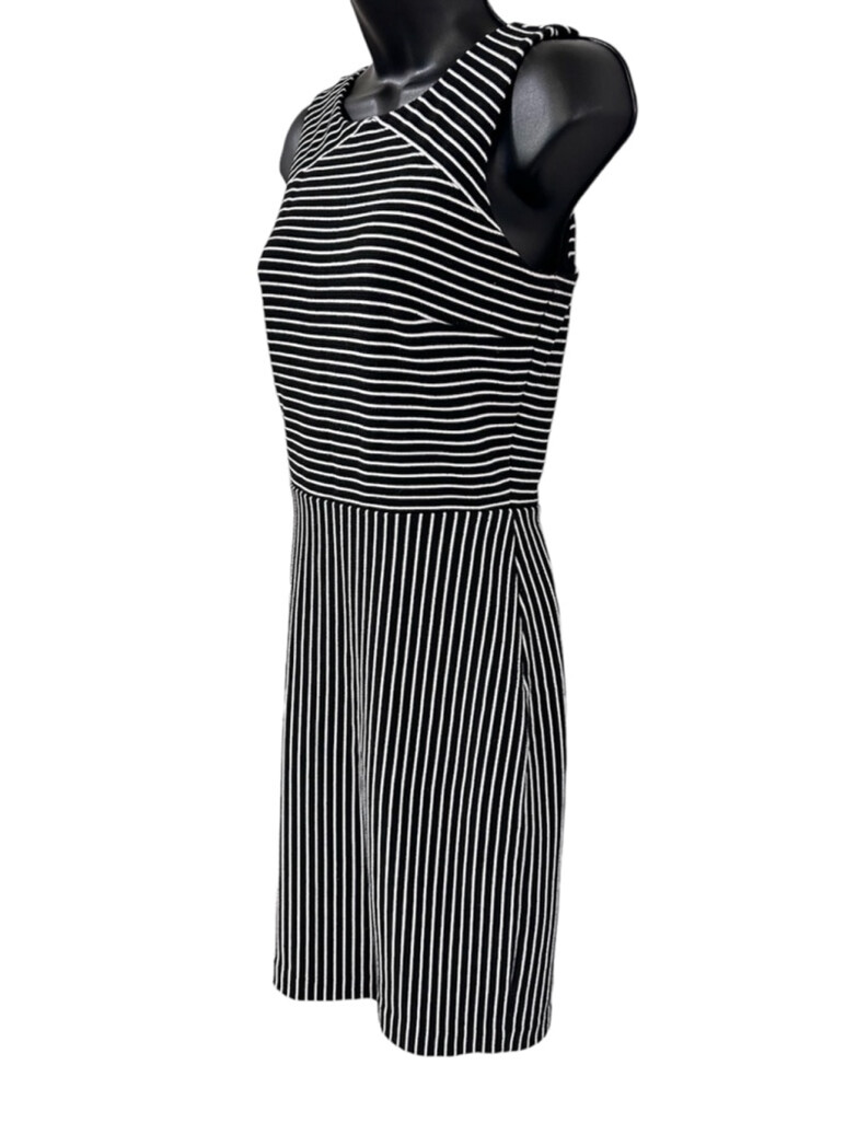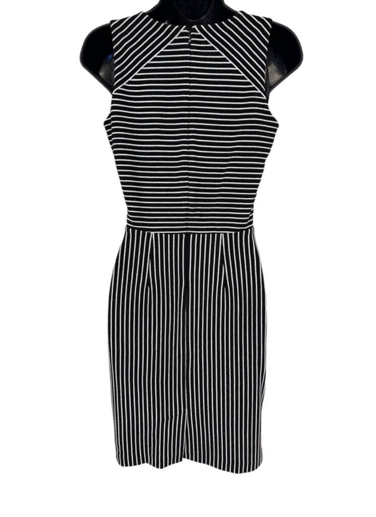 Preowned/in very good condition/excellent worn condition. Banana Republic Sheath Dress, Sleeveless Black & White Striped, Women’s Size 2. Might have normal signs of wear, with some loose threads however it has no tears, rips or stains. * please note measurements are approximate and may not be 100% exact.