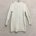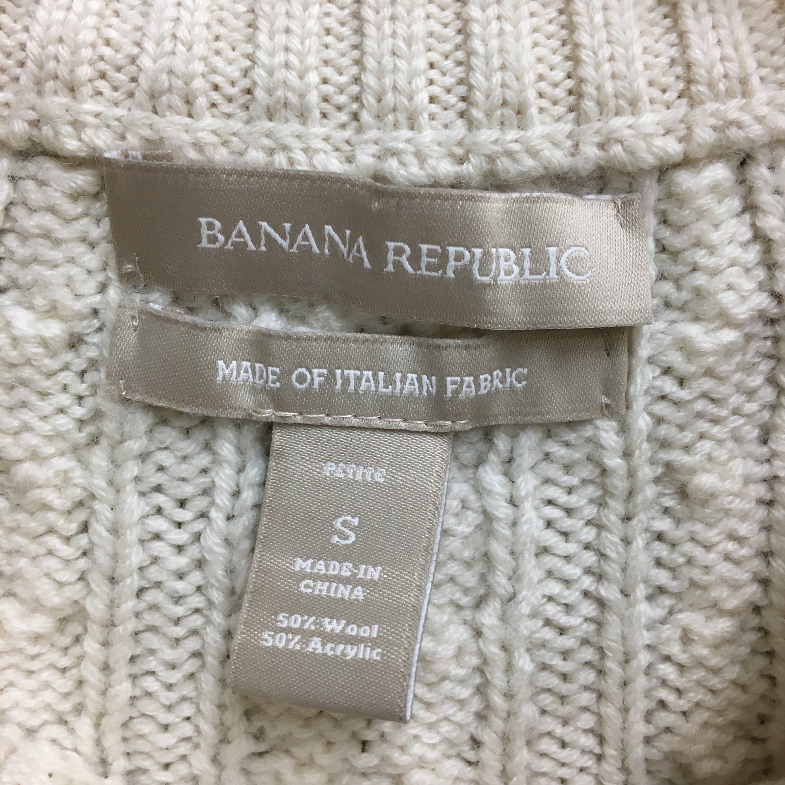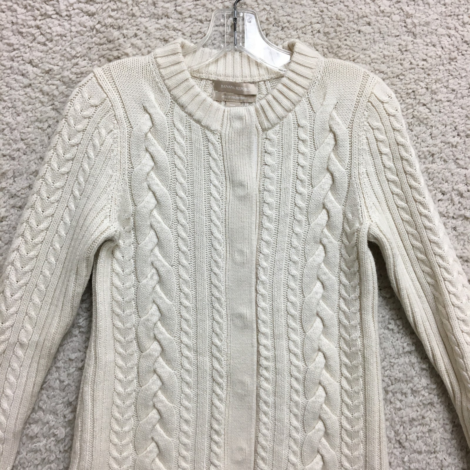 Banana Republic Sweater Womens Small Cream Cable Knit Long Cardigan Wool Blend Condition: Gently worn, no visible flaws, all buttons intact Classic mid-thigh length cable knit cardigan sweater Tag size: Small (Petite) Color: Cream/Ivory Material: 50% Wool, 50% Acrylic Made of Italian fabric (as stated on tag) Button front closure with hidden placket Rib knit collar, cuffs, and hem for a cozy fit Long sleeves with cable knit detail throughout Banana Republic logo label at neck Made in China Approximate measurements (see photos): - Pit to pit: 17.5 inches - Length (shoulder to hem): 32 inches Stylish cold-weather layering piece in a soft wool blend