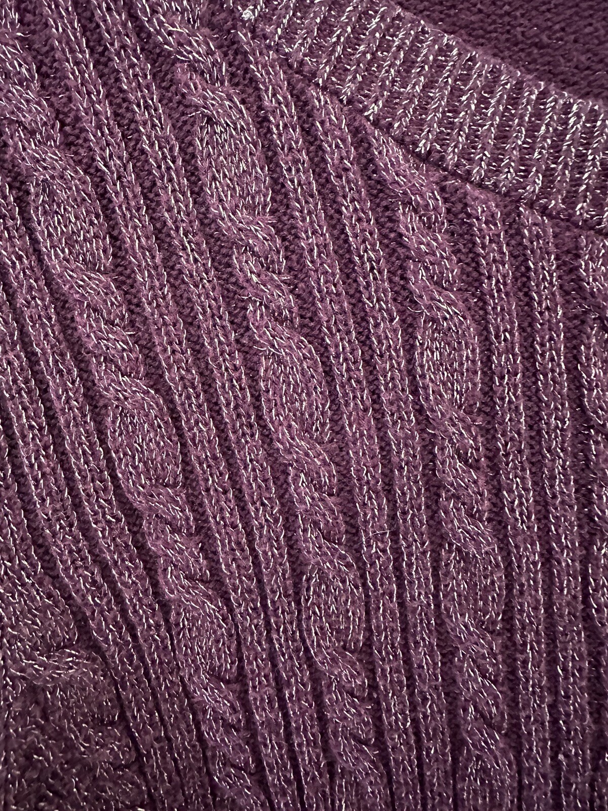 This beautiful Banana Republic sweater is perfect for any occasion. With a crew neckline and long balloon sleeves, it features a stunning multicolor metallic cable-knit design that adds a touch of sparkle and glimmer. Made from a blend of polyester, angora rabbit hair, cotton, and metallic fibers, this sweater is stretchy and comfortable to wear in any season. Whether you're dressing up for a party, dressing down for work, or simply looking for a cozy everyday sweater, this piece is a must-have addition to your wardrobe. It's available in size L and is hand wash only. Shop now and add some sparkle to your closet!