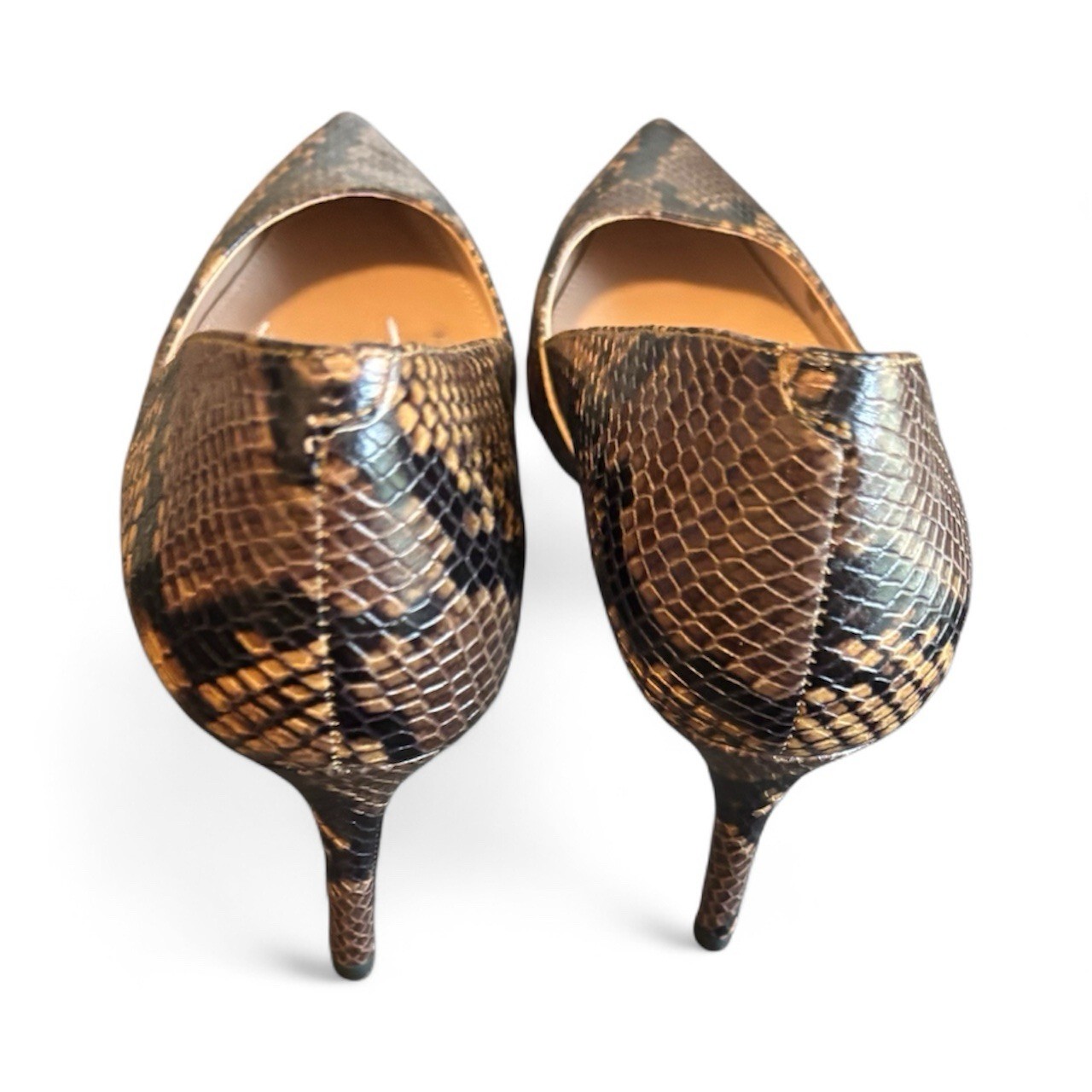 This product is a pair of Banana Republic women's heels in size 10. They feature a pointed toe, slip-on closure, stiletto heel, and snake skin accent. Brown and black.