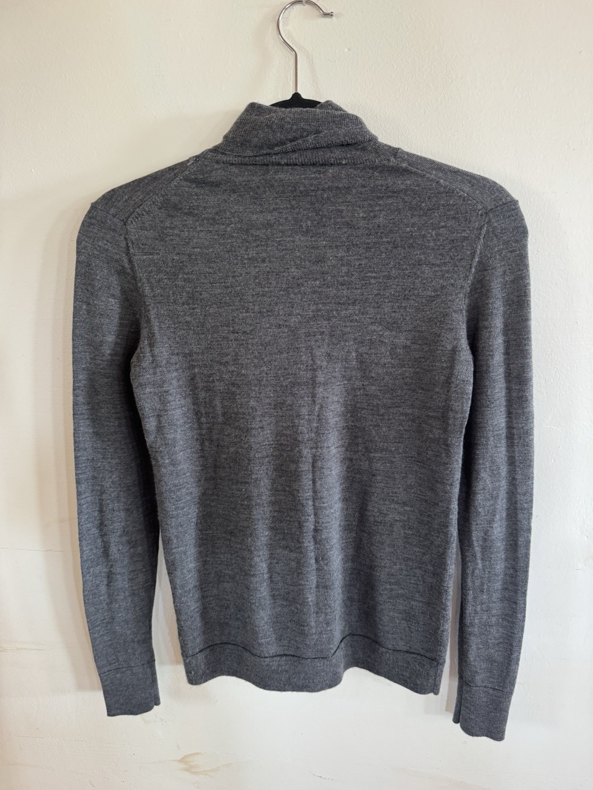 This Banana Republic Women's XS Merino Wool Turtleneck Sweater in gray is a versatile and stylish addition to any wardrobe. The tight-knit fabric and lightweight design make it perfect for all seasons, while the moisture-wicking properties ensure you stay comfortable even in colder weather. The pullover style, long sleeves, and turtleneck neckline provide a classic and cozy look, suitable for casual outings, workwear, or business meetings. Made from high-quality wool, this sweater is machine washable and offers a stretchy fit for added convenience. Shoulder to hem:23” Sleeve length:25” Chest across:17” Hips across:16” B-B
