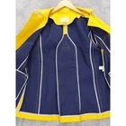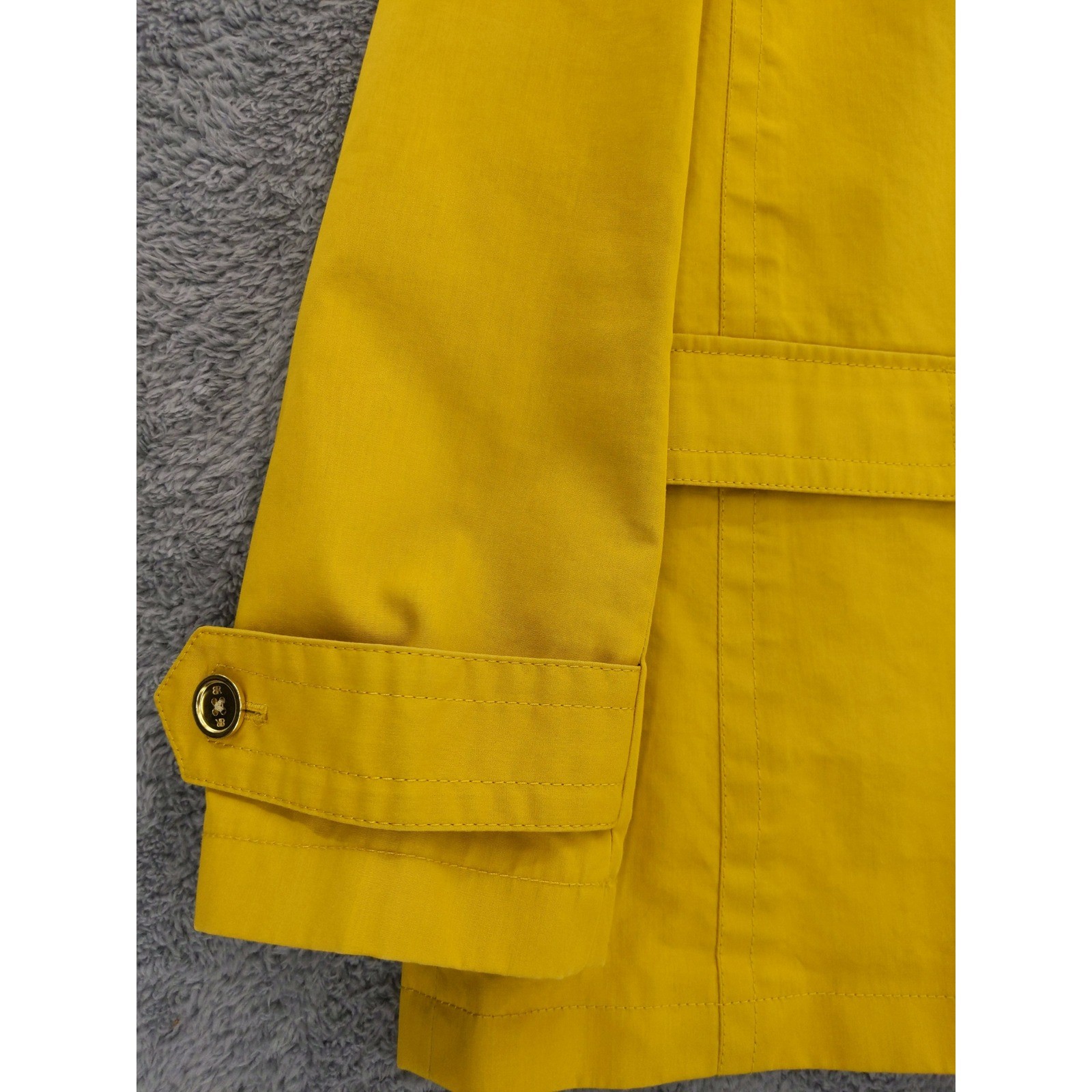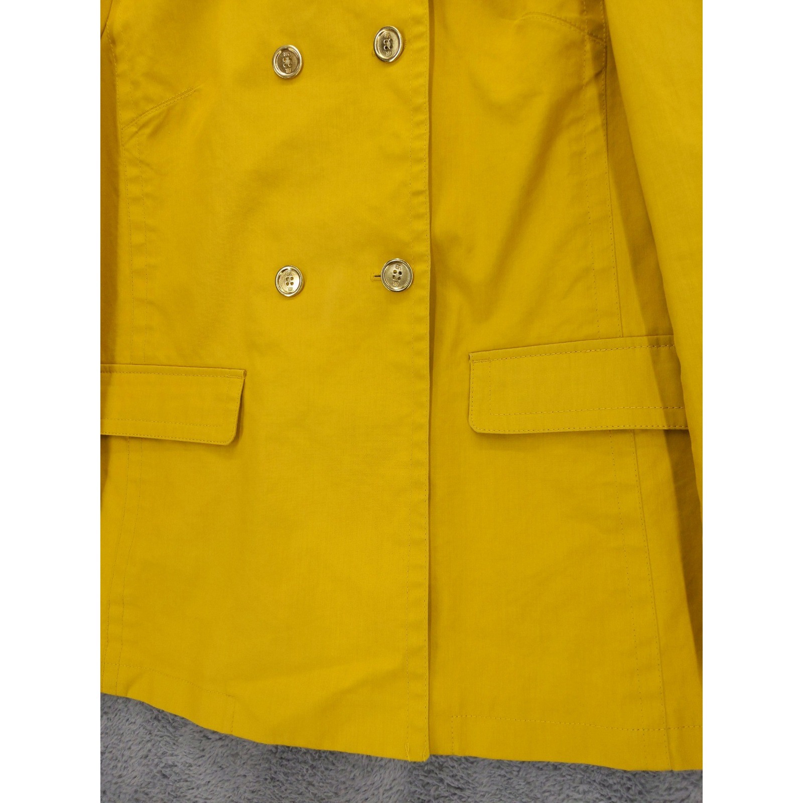 A classic double-breasted trench coat in a vibrant yellow hue. This stylish jacket features a traditional collar, prominent gold-tone buttons, and two flap pockets on the front. The cuffs are detailed with button tab closures. On the back, a sophisticated vent provides ease of movement. Made from 100% cotton, this piece offers both durability and a refined look. Measurements: • Chest Across: 21 in • Neck to Hem (Back): 28 in Excellent used condition with no holes, tears, heavy wear, or stains.