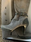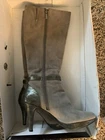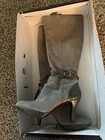Good condition Step into elegance and style with the Bandolino BDCala Dressy Heel Boots. Perfect for any occasion, these knee-high boots feature a sleek gray suede upper material and a chic almond toe shape. The synthetic lining and regular calf width provide a comfortable fit, while the side zip closure adds a touch of convenience. With a high heel height of 3-3.9 inches, these riding boots give you a touch of sophistication and class. The Bandolino BDCala model is perfect for women who want to make a statement with their footwear. Get ready to turn heads with these stylish boots that are sure to become your new favorite.